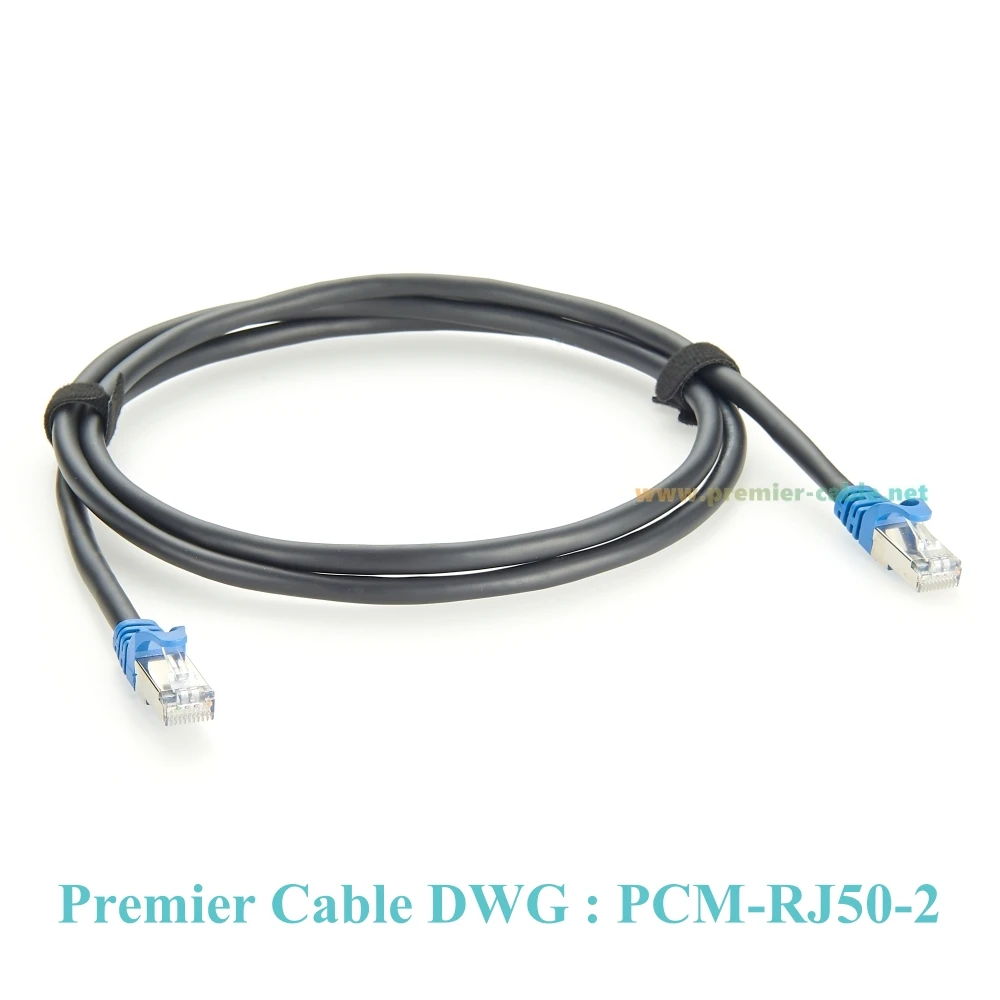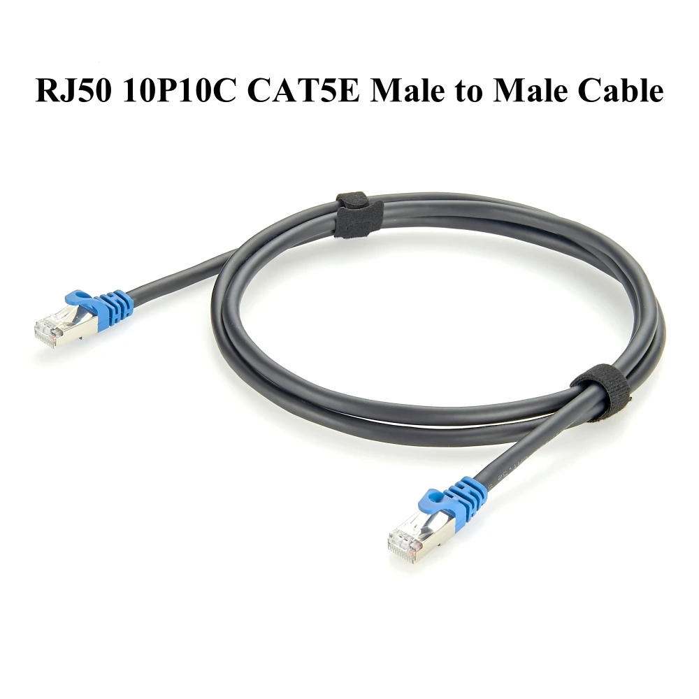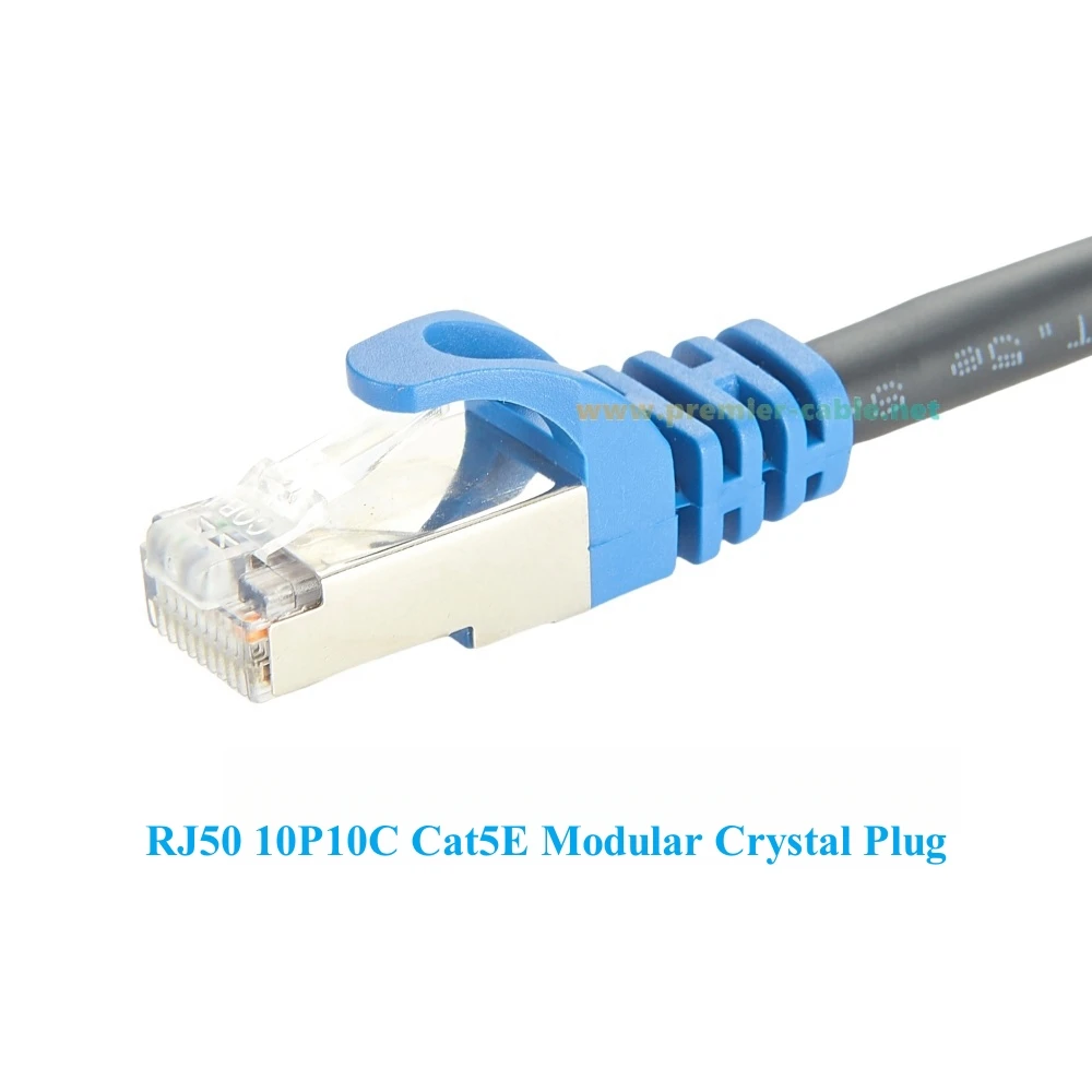 - RJ50 10P10C shielded male connectors with transparent housings showcasing internal wiring and gold-plated contacts for corrosion resistance.