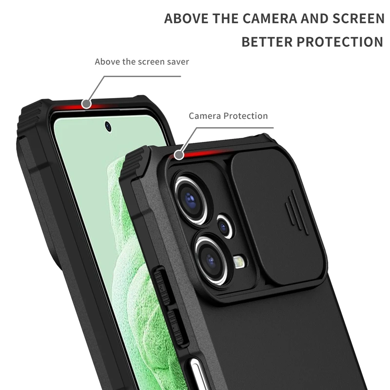 This high-quality, multi-layer shockproof phone case is specially crafted for Xiaomi Redmi Note 12 4G and 5G models. Its rugged yet sleek design combines durable plastic with textured rubber armor, offering excellent protection from drops, impacts, and daily wear. The case covers the entire back and sides, ensuring comprehensive safeguard. Its full coverage design features a convenient slide push-pull window for easy access and protection of the camera lens, which is encircled by a metallic ring for a stylish accent. The built-in 360-degree ring finger stand enables secure grip and hands-free viewing, perfect for any situation. Available in eight vibrant colors, this case blends durability with modern elegance, making it a must-have accessory that reflects your personal style while safeguarding your device seamlessly.