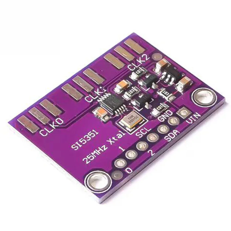 Experience precise frequency control with this sleek and professional SI5351A clock generator module. Designed for versatile applications, it features a vibrant purple soldermask complemented by gold-plated contact pads, offering a modern aesthetic that blends technical excellence with visual appeal. Its compact rectangular shape makes integration into your projects seamless, whether you're working on RF development or digital signal processing. The white printed labels ensure clear identification of connection points, while the sturdy mounting holes guarantee secure placement. With a built-in 3.3V LDO regulator and level-shifting circuitry, this module safely interfaces with your existing logic levels, providing reliable performance. Elevate your electronic projects with this high-quality, customizable frequency generator, tailored to meet demanding technical specifications.