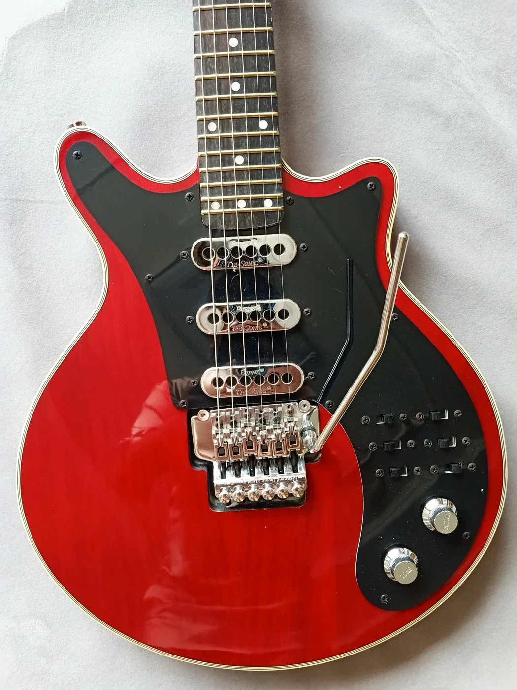 Imagine owning this stunning, professionally crafted electric guitar, finished in a vibrant cherry red glossy coat that captures attention instantly. Its sleek mahogany body and neck combine with a rosewood fretboard, featuring 22 precise frets and a 628mm scale length to deliver exceptional playability. The 42mm nut width provides comfort for diverse playing styles. Equipped with three Burns Tri-Sonic pickups and a double locking tremolo bridge, this guitar offers versatile tonal options and dynamic pitch effects. Chrome hardware and standard machine heads enhance durability and aesthetics. With master volume and tone controls plus a 3-way switch, your sound can be perfectly tailored. This instrument is perfect for passionate musicians seeking professional quality and iconic style.