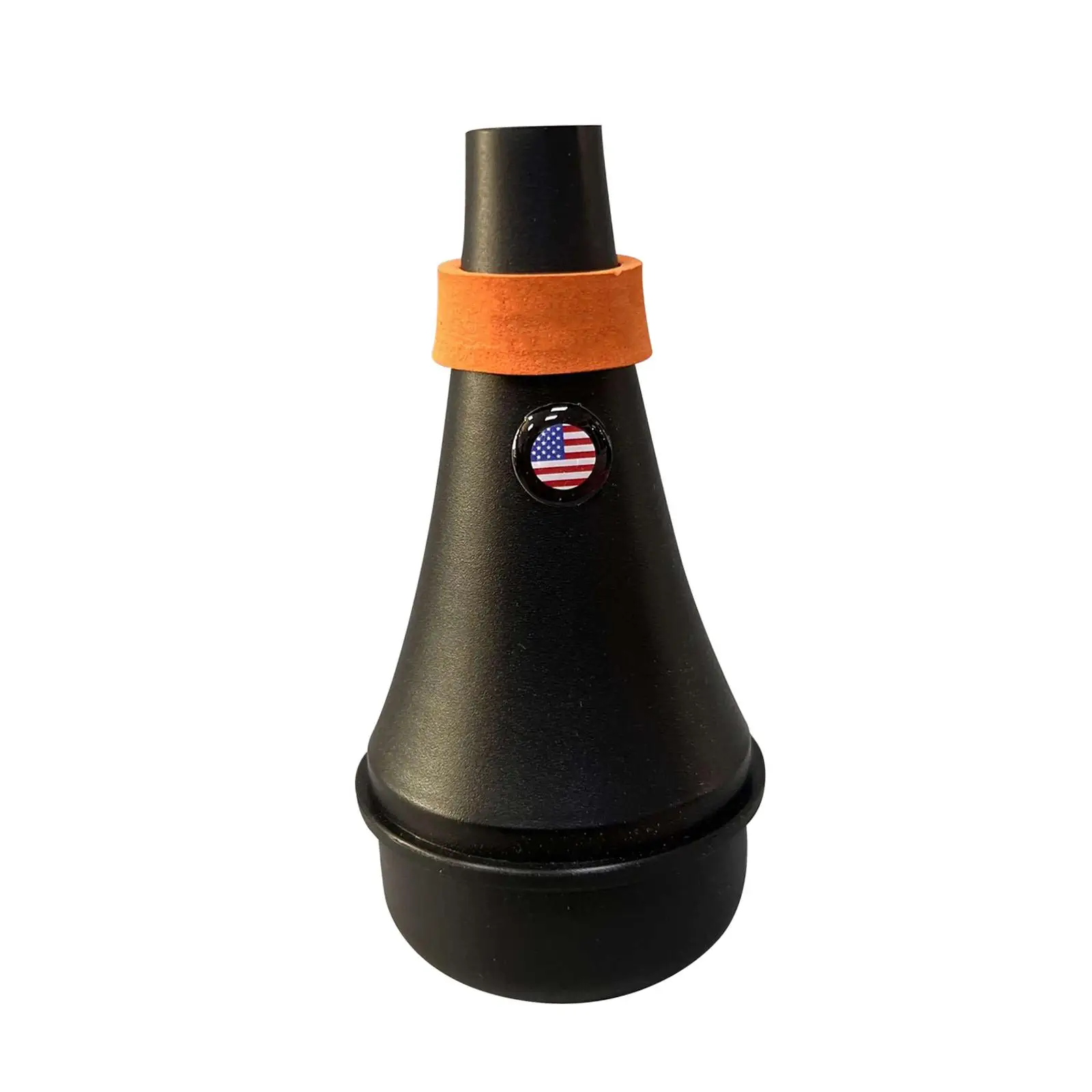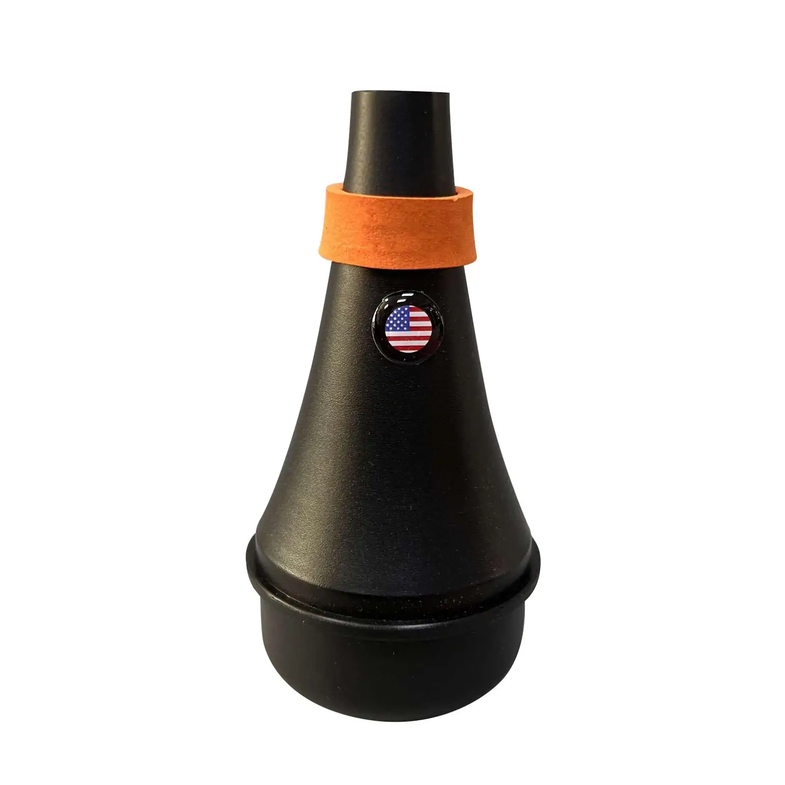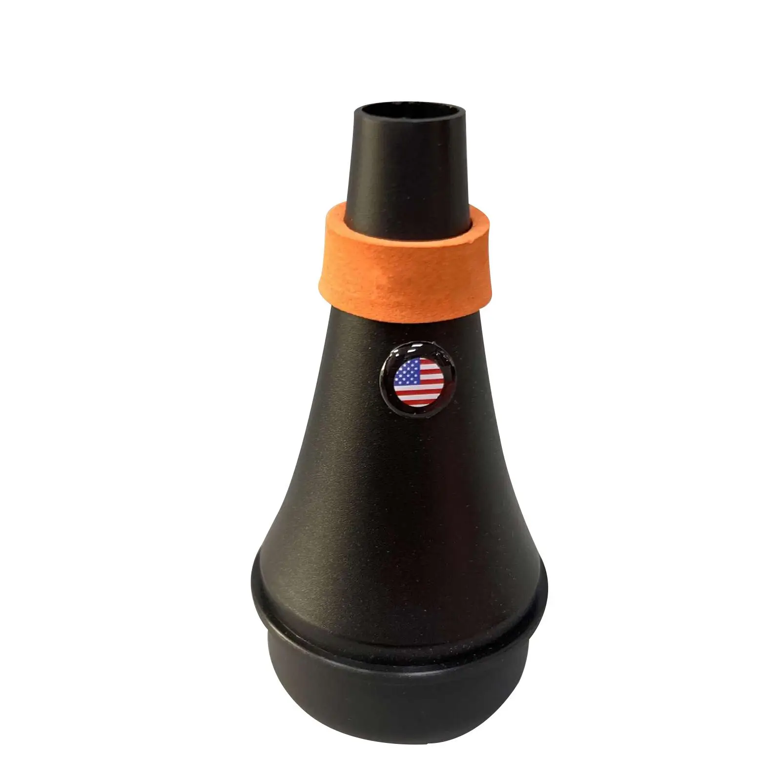 Experience a new level of convenience with this sleek black trumpet mute, designed for discreet and silent practice sessions. Crafted from durable, lightweight PP material, this mute measures approximately 13.5 cm in length and 5.3 cm in diameter, ensuring portability and easy handling. Its conical shape fits snugly inside most trumpet bells, effectively reducing noise without compromising sound quality. An eye-catching orange felt ring around the middle provides a soft cushioning and a touch of color, while the patriotic emblem adds a subtle yet distinctive detail. Perfect for indoor and outdoor use, this mute helps you practice anytime without disturbing others. Whether you're a beginner or a passionate enthusiast, this accessory offers comfort and flexibility for all your trumpet sessions.