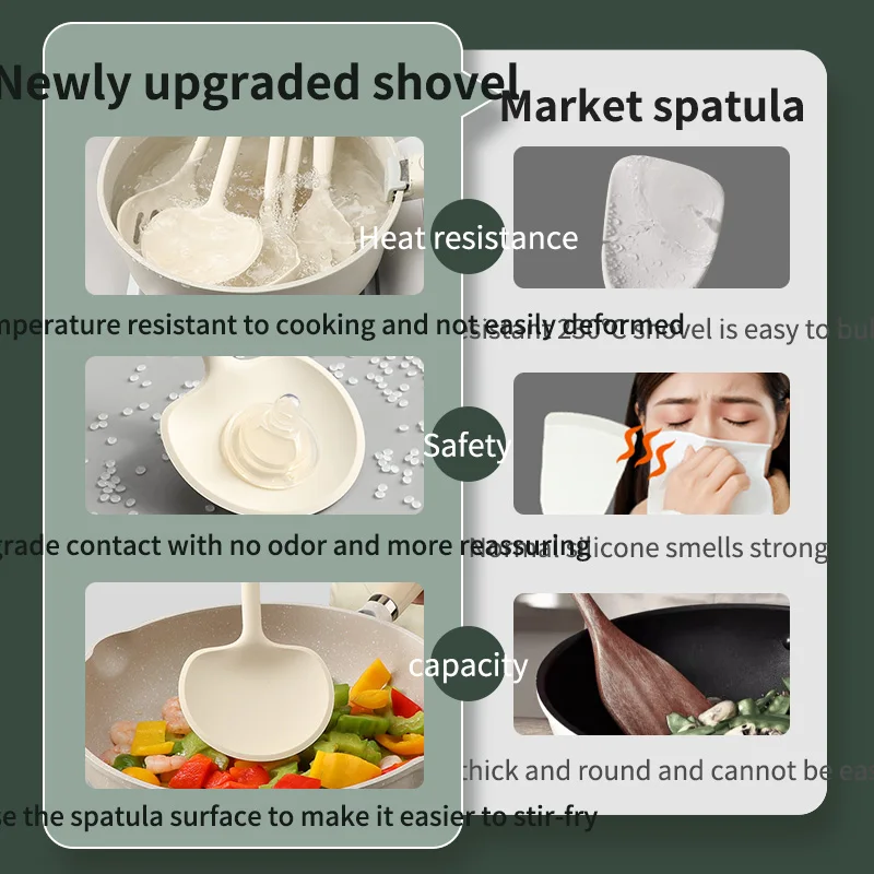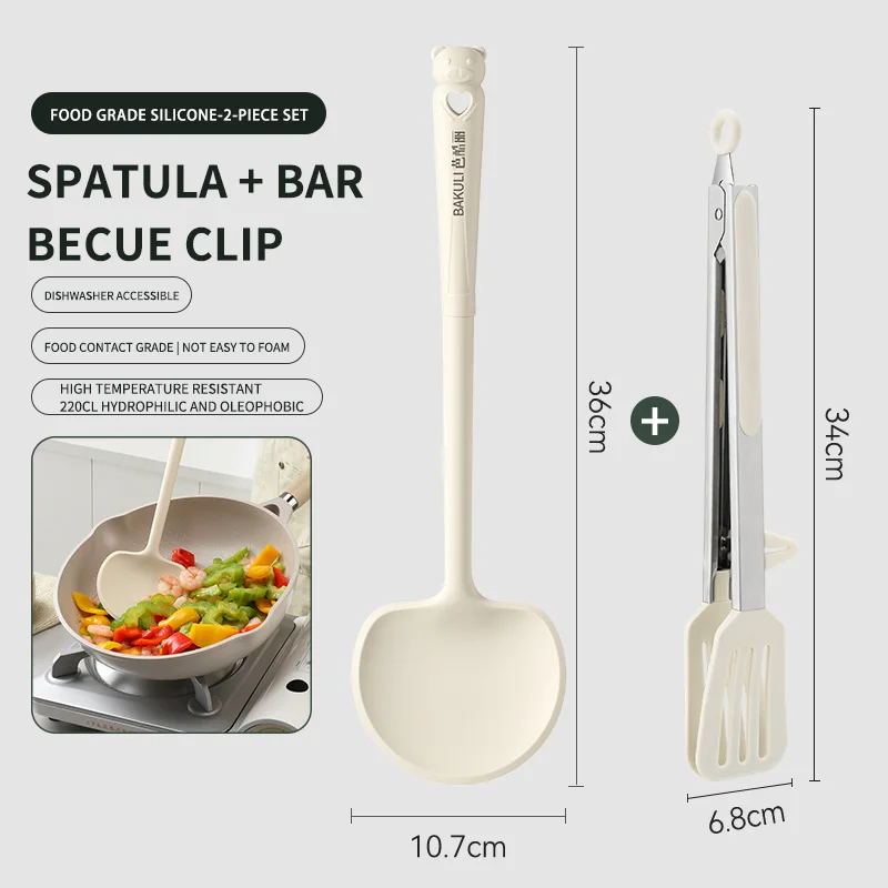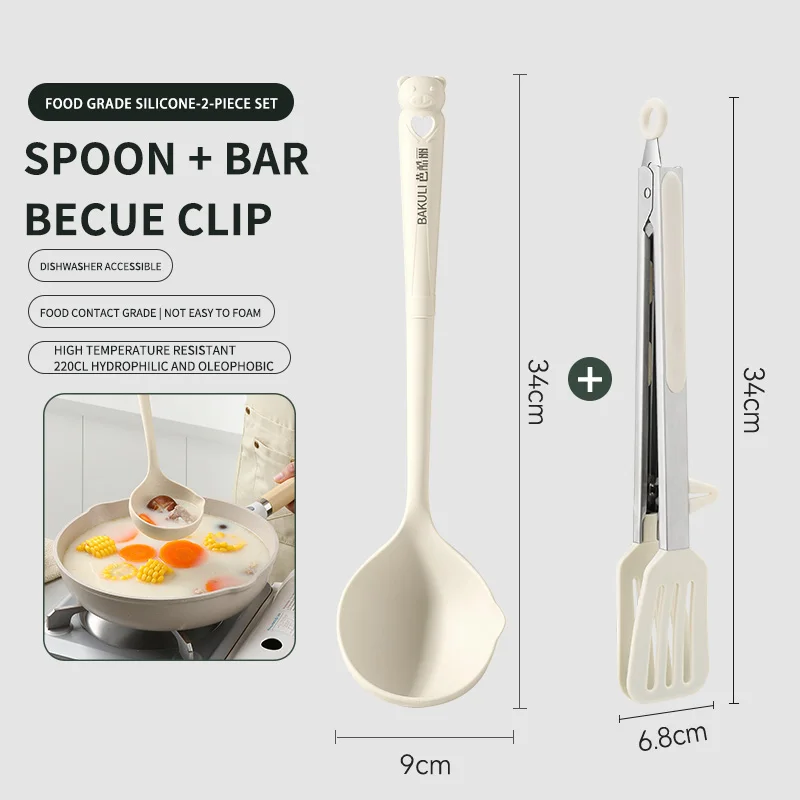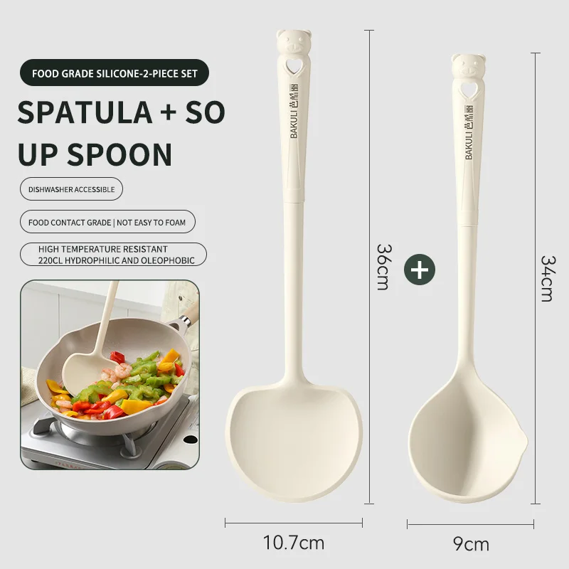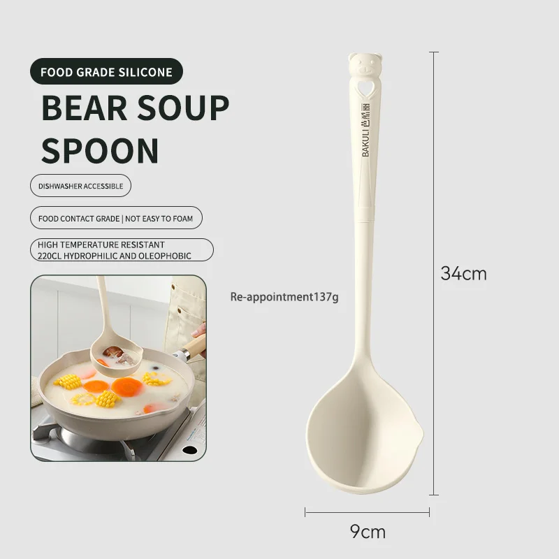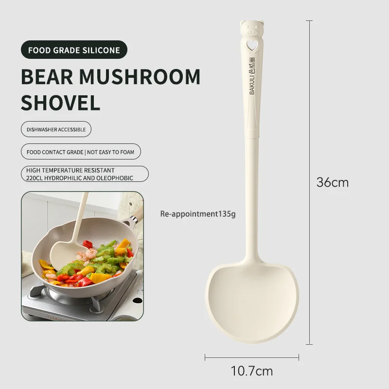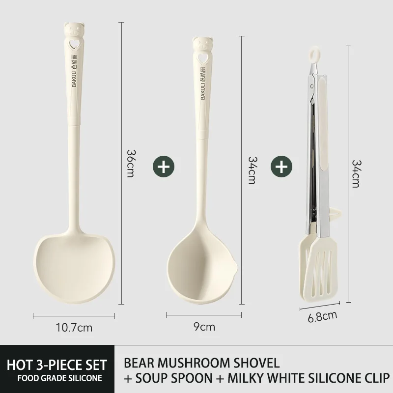 This cooking set is a delightful addition to any kitchen, featuring three essential silicone utensils: a bear-shaped mushroom spatula, a regular mushroom spatula, and a charming bear-themed soup spoon. Each piece is crafted in a light beige or off-white color for a modern aesthetic. The ergonomic handles provide comfort during use and are adorned with playful bear motifs, enhancing their appeal. These eco-friendly utensils are perfect for non-stick cookware, ensuring safe cooking without scratches while being easy to clean. The thoughtful design marries playful charm with practicality, making cooking enjoyable and efficient.