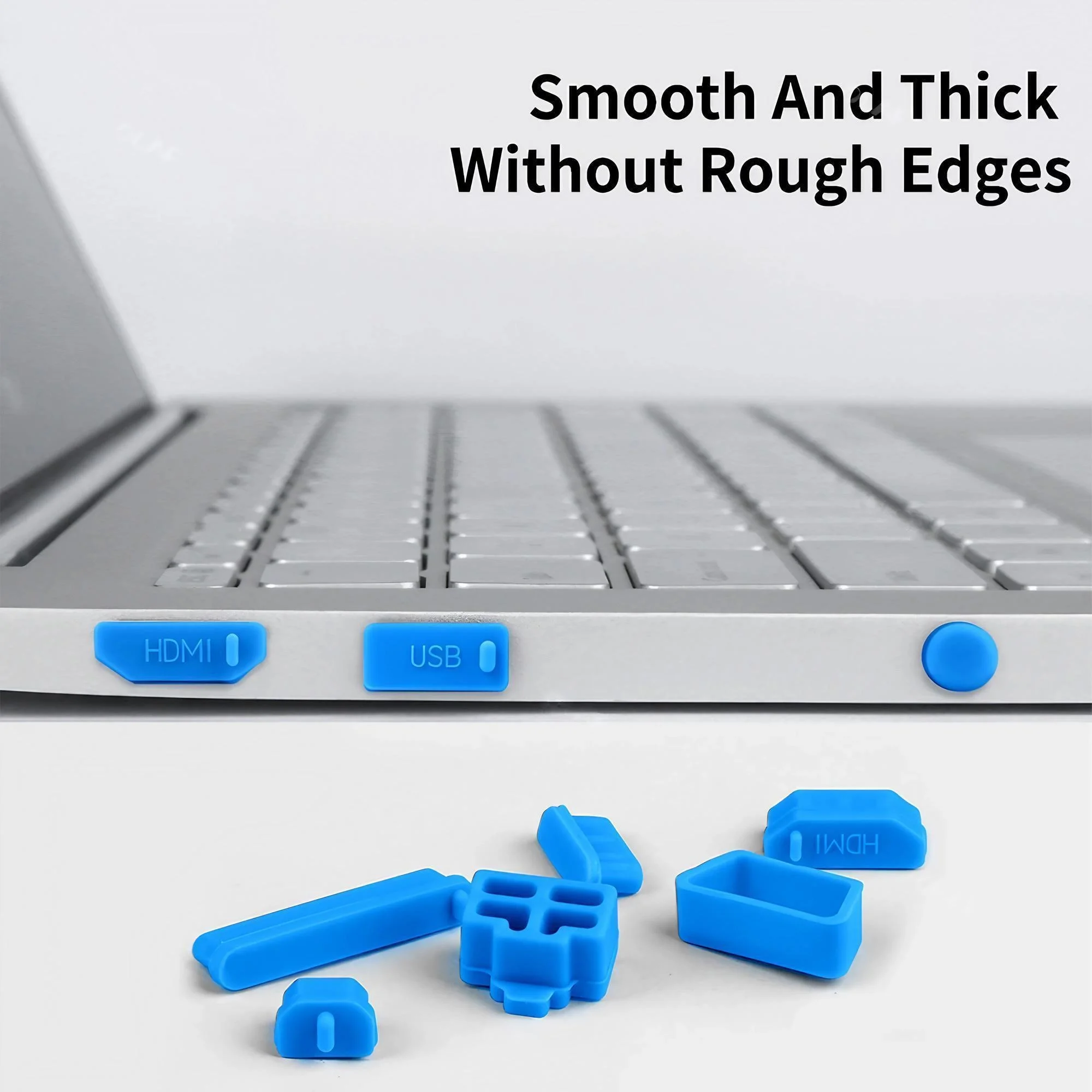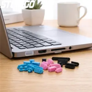 - Universal silicone dust plugs designed to fit standard computer and electronic ports including USB, Type-C, HDMI, SD, VGA, RJ45, eSATA, and audio jacks for comprehensive protection.
