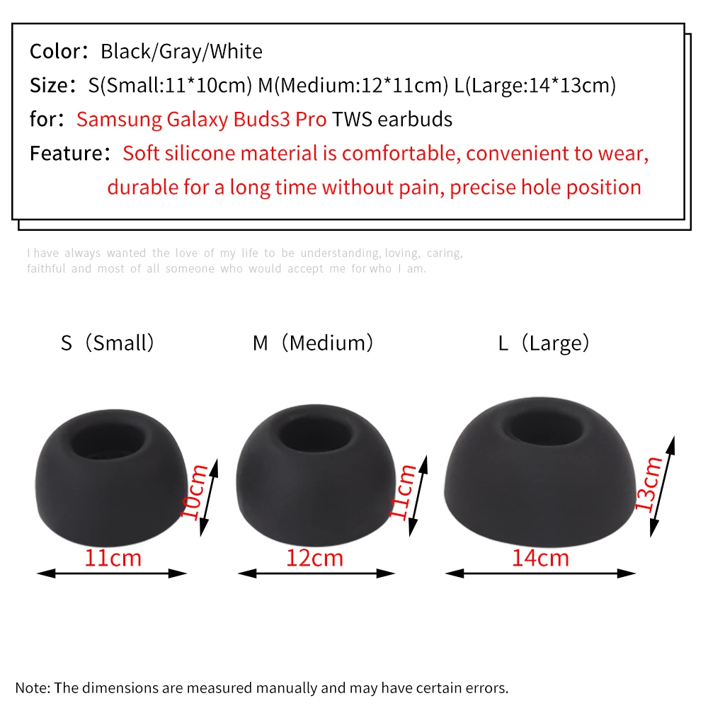 Enhance your listening experience with our Silicone Ear Tips, specifically designed for the Samsung Galaxy Buds3 Pro True Wireless Earbuds. Available in Black, Gray, and White, these soft silicone tips offer unmatched comfort and durability, allowing you to enjoy your favorite music or podcasts for hours without discomfort or worry about them falling out during exercise. Experience a secure fit that ensures optimal sound quality and performance, making every listening session enjoyable and hassle-free. Elevate your earbuds with these essential accessories and enjoy the perfect blend of style and functionality.