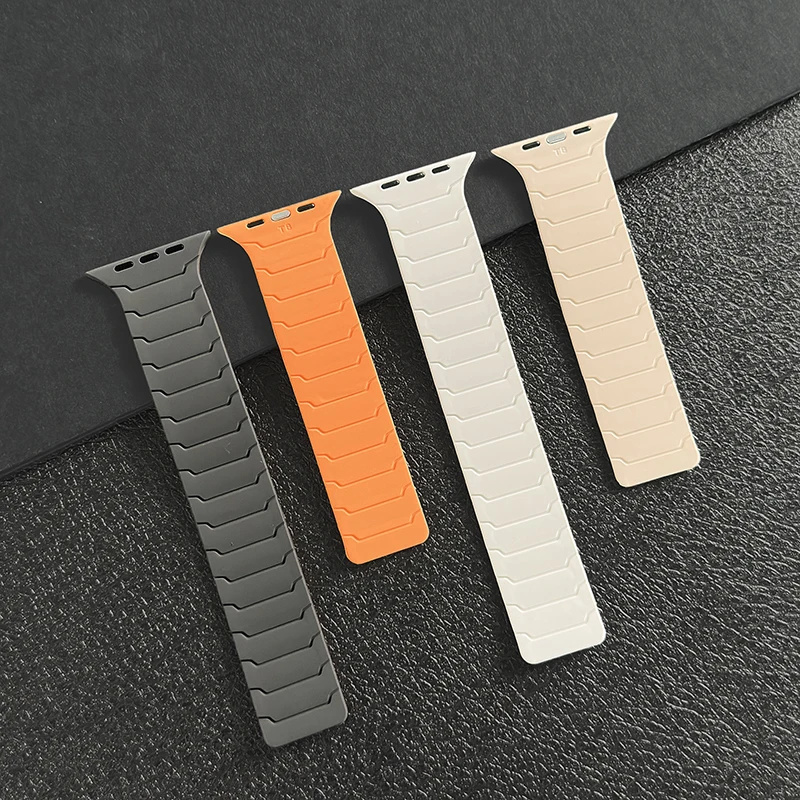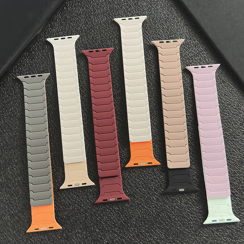 Enhance your Apple Watch experience with this versatile silicone magnetic strap, compatible with Series 5 through 11, SE, and sizes ranging from 38mm to 46mm. Crafted from durable silicone, it features a secure magnetic loop clasp for a comfortable fit. Available in a variety of stylish colors including black, starlight, midnight blue, milk tea black, wine red, pink starlight, antique white, black orange, grey orange, green black, purple mint, chocolate black, midnight black, orange, and starry gray, this unisex band combines sporty aesthetics with everyday comfort. Perfect for adding a personalized touch to your smartwatch while ensuring a secure, flexible fit throughout your day.