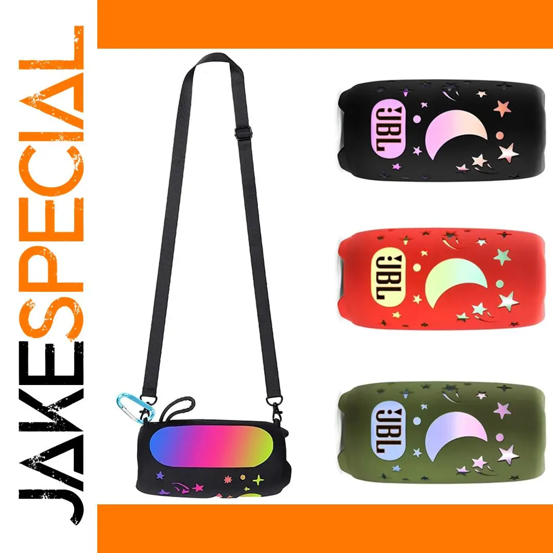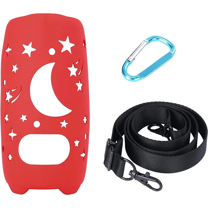 Immerse yourself in a playful yet sturdy accessory designed for the JBL Pulse 5 portable Bluetooth speaker. Crafted from durable silicone, this protective case snugly surrounds your speaker with a sleek, rounded rectangular shape. The delightful cutout pattern of moons and stars creates an enchanting celestial theme, perfectly matching the speaker’s vibrant LED lighting that glows softly through the openings in shades of pinkish-purple, yellow, and purple. Available in eye-catching black, vivid red, and lively green, each case enhances your speaker’s appearance while safeguarding it from shocks, water, and knocks. Its matte finish offers both a modern look and a comfortable grip, ensuring you can carry or hang your speaker effortlessly wherever you go.