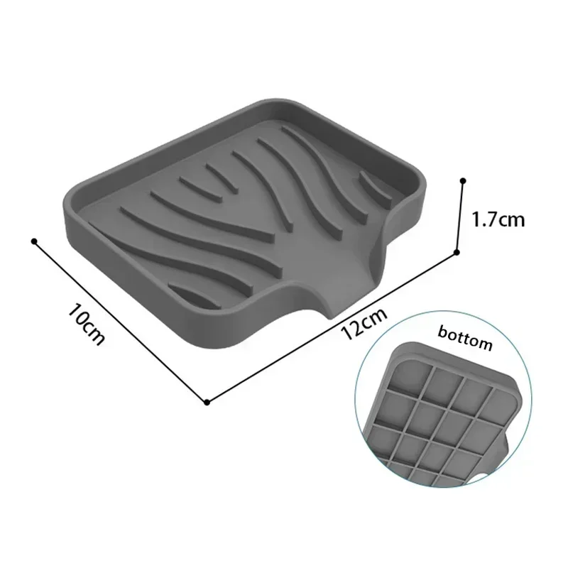 Imagine having a tidy, organized sink area with this modern soap holder. Crafted from smooth silicone in a neutral light gray, it combines minimalism with practicality. The rectangular shape with rounded edges offers a stylish look while providing generous space for soap bars, sponges, dish brushes, and liquid soap dispensers. Its slightly inclined base, featuring parallel ridges, ensures water flows smoothly toward the built-in drain spout, keeping your items dry and preventing water from pooling. Available in versatile colors—white, black, gray, and green—you can effortlessly match your bathroom or kitchen decor. With a size of 12x10x1.7 cm, this holder is compact yet efficient, making sink cleanup easier and more pleasant every day.