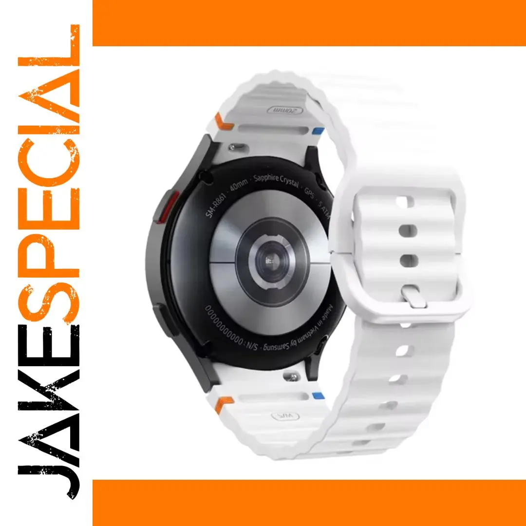 Experience the perfect blend of style and functionality with this silicone watch band, designed specifically for various Samsung Galaxy Watch models. Its clean white hue, enhanced by flexible, textured material, ensures comfort throughout the day. The smooth, glossy finish provides a touch of elegance, while the added accents of orange and blue provide a stylish flair. With multiple adjustable holes for a perfect fit and a sturdy buckle mechanism keeping it securely attached during any activity, you'll find this band not only enhances your watch’s aesthetics but also elevates your daily experience.