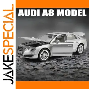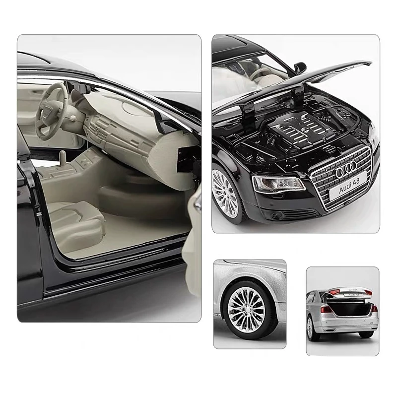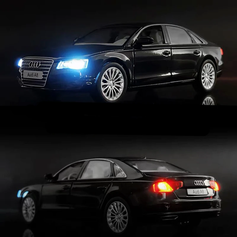 Experience the luxury of the 1/32 scale diecast A8 model, crafted from alloy and plastic with a polished metallic silver, black, or white finish. Its sleek, modern design features highly detailed elements such as multi-spoke alloy wheels, a distinctive front grille with the four-ring logo, and realistic headlights, side mirrors, and door handles. The model boasts openable components, including the engine hood and trunk, revealing intricate engine and interior details like seats, steering wheel, and dashboard. Equipped with sound and light functions activated by opening doors or hood, this premium collectible offers both aesthetics and realism for avid car enthusiasts and collectors alike.