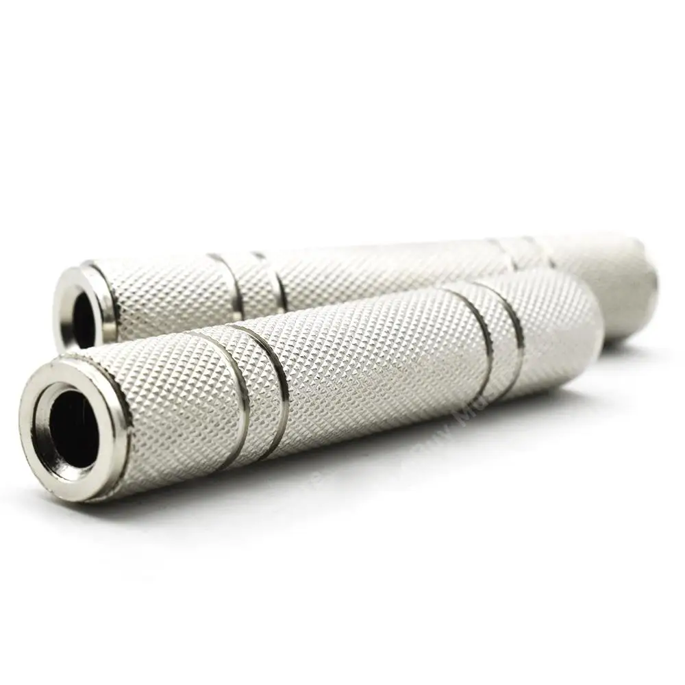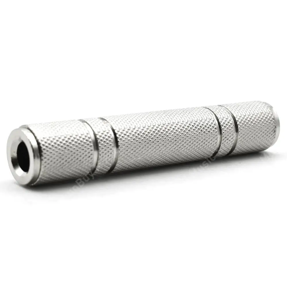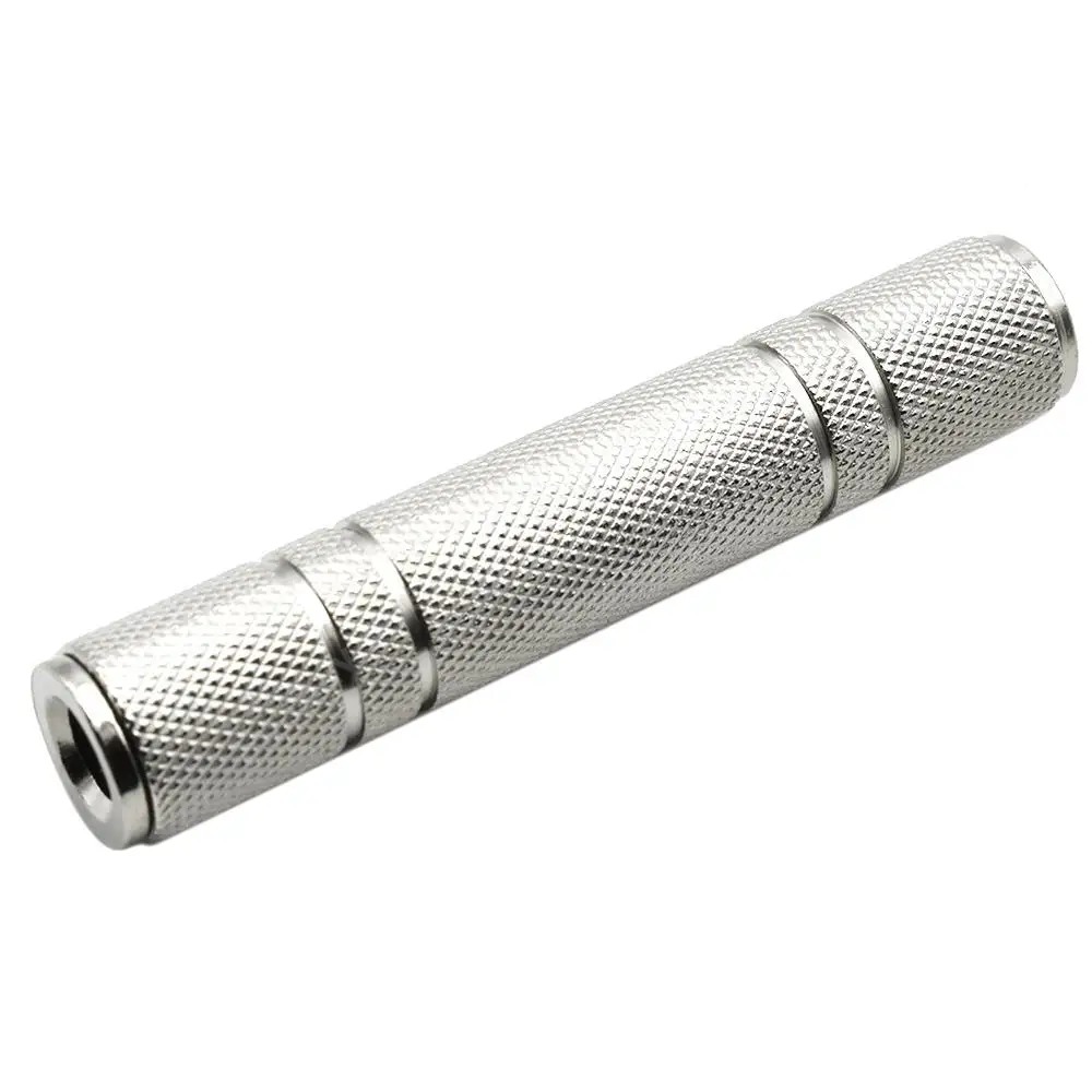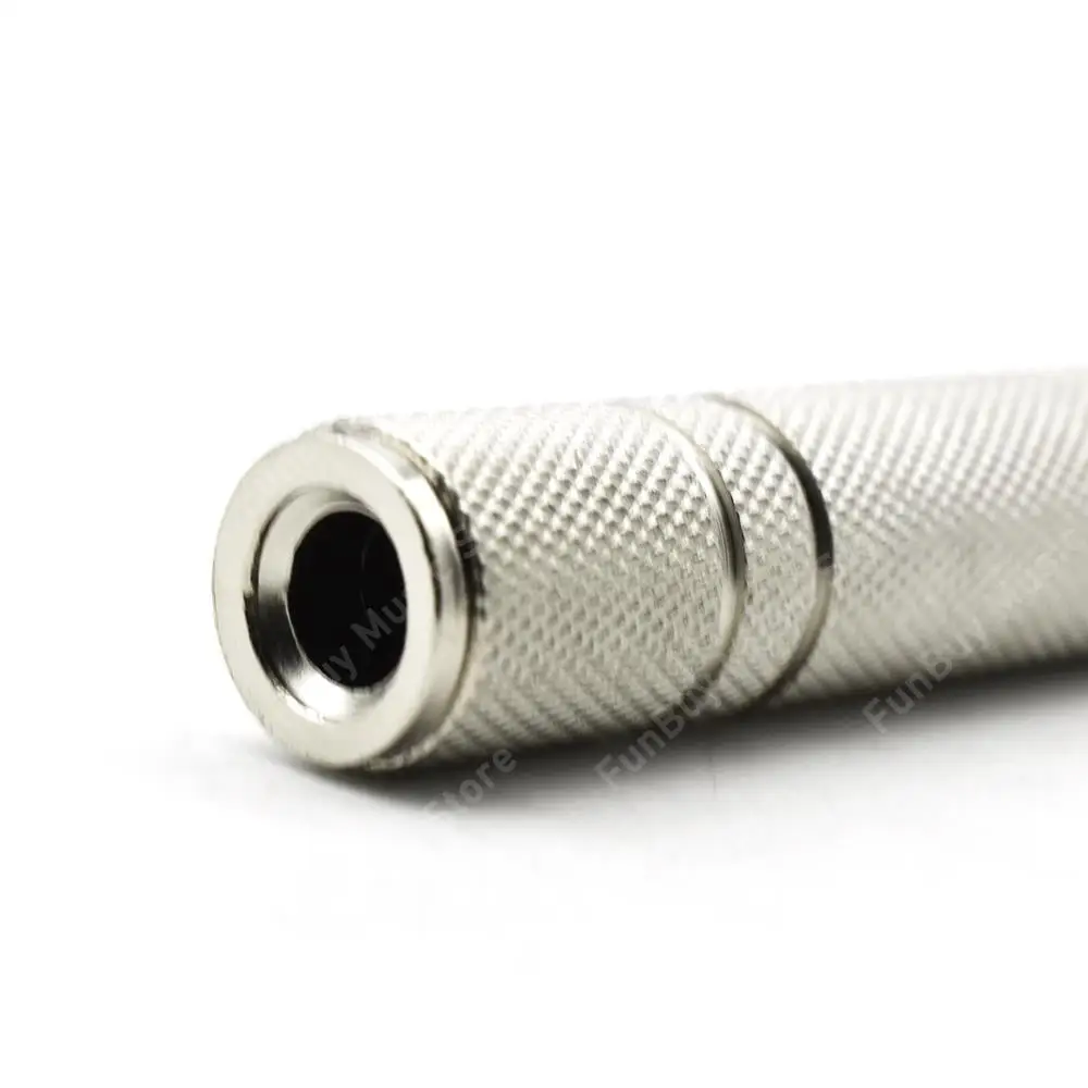 Imagine effortlessly extending your guitar or amplifier setup with this stylish yet practical connector. Crafted with a shiny silver-metal finish, it exudes a sleek professional vibe. Its cylindrical shape, measuring approximately 70mm in length and 11.5mm in diameter, offers a compact and sturdy design that fits comfortably in your hand. The knurled surface provides a textured grip, ensuring easy handling and a secure connection every time. Made from durable metal and plastic components, this extender connector is built to withstand regular use. Its high-quality finish and precise construction make it an ideal addition for musicians seeking reliable, high-performance cable extensions for guitars, effect pedals, or amplifiers. Elevate your setup with this combination of aesthetics and functionality.