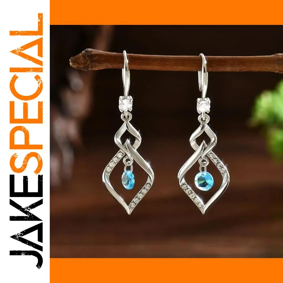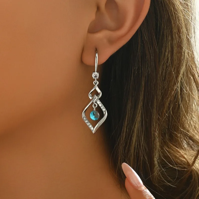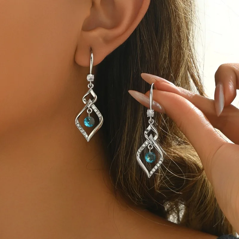 - The elongated twisted shape with a dangling teardrop blue gemstone adds movement and brilliance, catching the eye with every gesture.