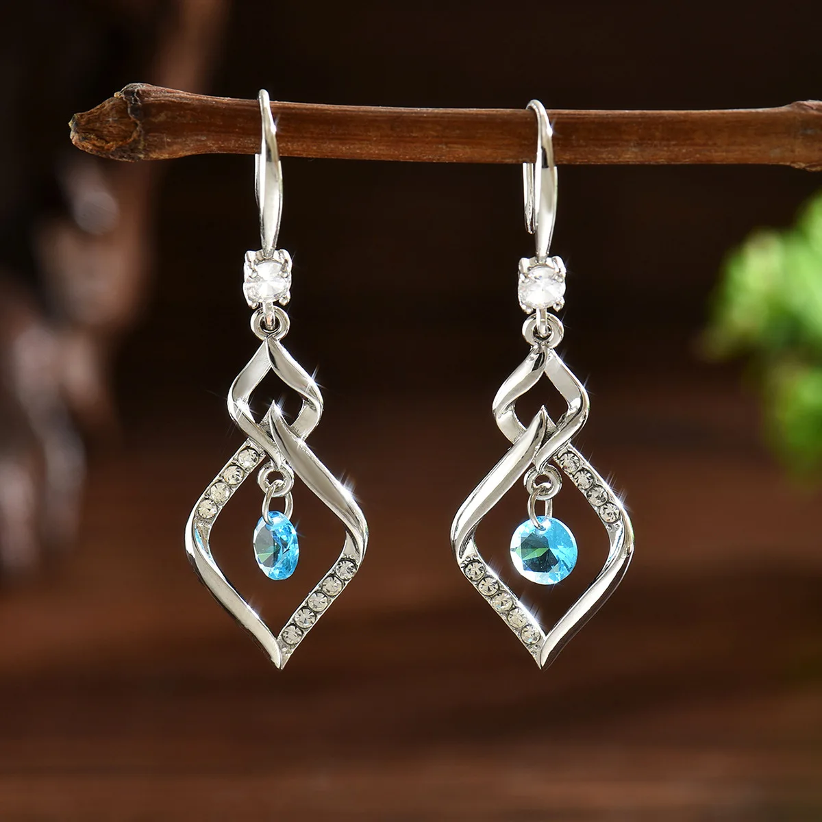 Imagine elevating your style effortlessly with this stunning pair of drop earrings. Crafted from durable zinc alloy with a sleek silver or gold finish, they feature a modern geometric design lined with sparkling blue and white zircon stones. The elongated, twisted shape exudes contemporary elegance, perfect for both special occasions and everyday wear. Inside each earring, a tiny blue zircon sits near the top, with a larger faceted teardrop-shaped blue gemstone dangling freely, capturing and reflecting light beautifully. Tiny rhinestones adorn one side of the open outline, adding a subtle shimmer. These earrings are lightweight and comfortably designed, making them a versatile accessory that enhances any outfit, from casual to sophisticated. Experience the charm and confidence they bring to your look today.