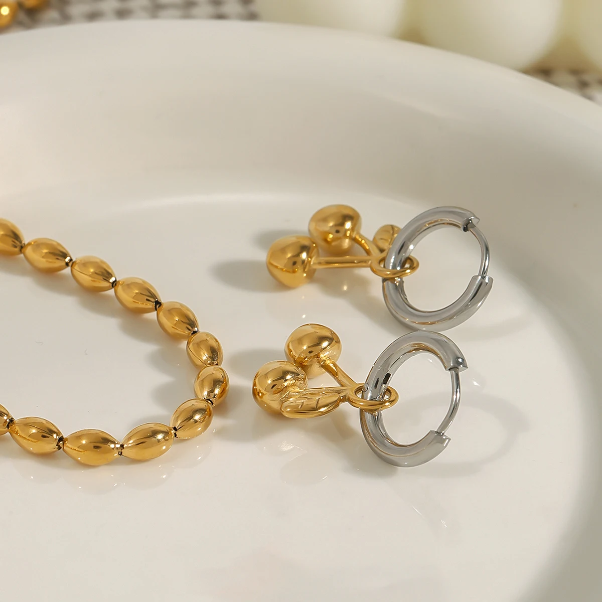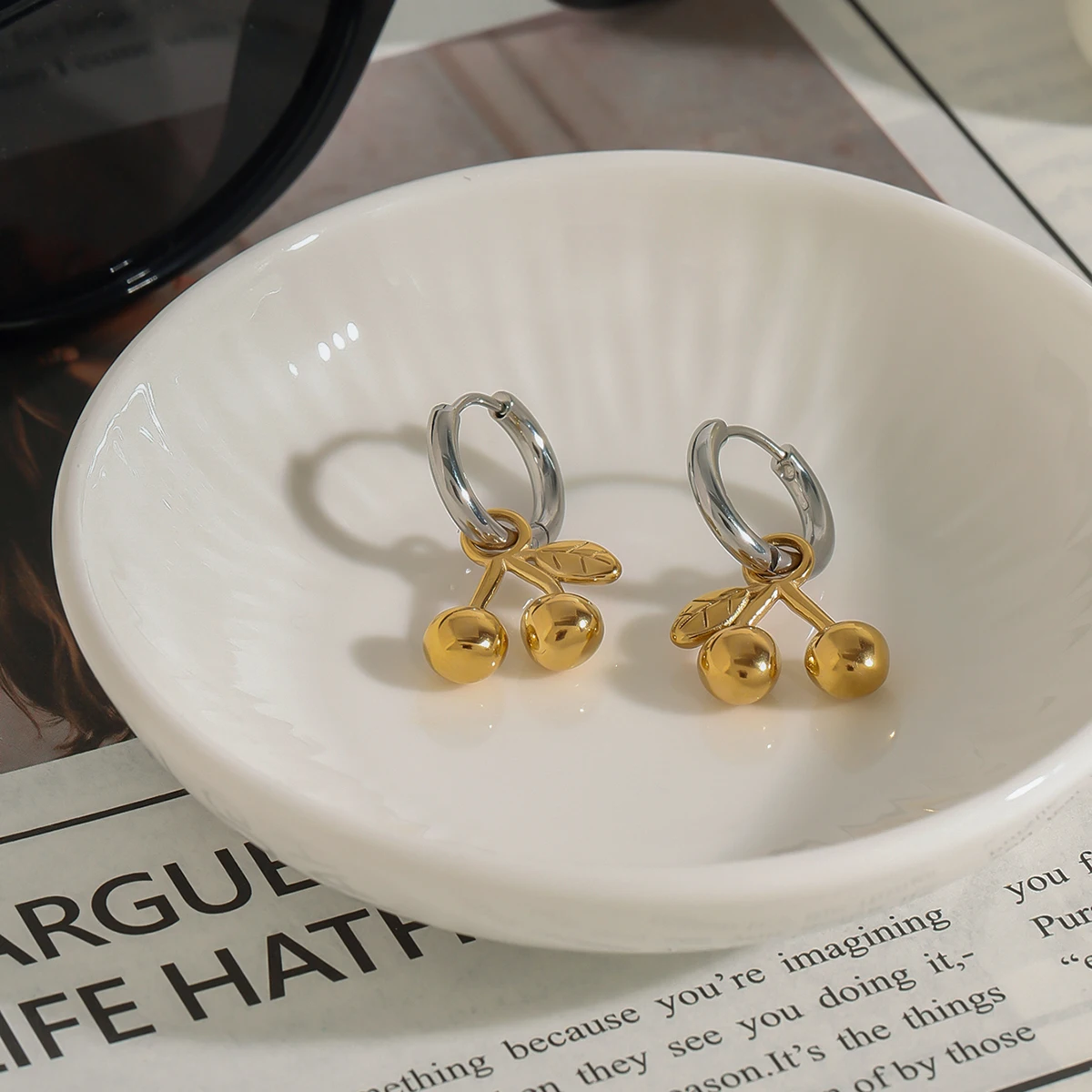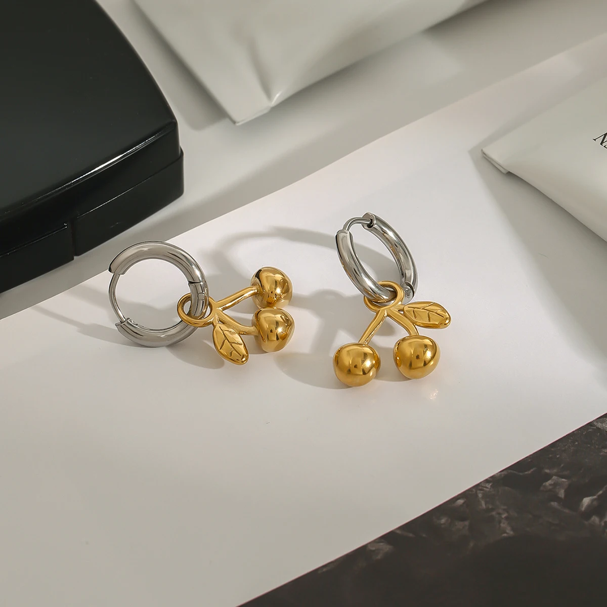 Elevate your style with these minimalist cherry pendant earrings, crafted from stainless steel with PVD gold coating for long-lasting, scratch-resistant color. Weighing only 15 grams, these trendy drop earrings feature charming food-inspired cherry and leaf motifs with a polished, reflective finish that catches the light beautifully. The sleek silver hoop provides a chic contrast, while the waterproof, nickel-free, lead-free, and cadmium-free design ensures comfort and durability. Perfectly suited for modern women seeking a playful yet sophisticated accessory, these earrings combine fashion and function effortlessly, making them an eye-catching addition to your jewelry collection.