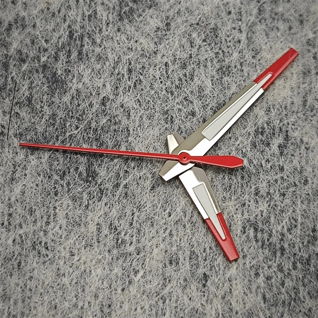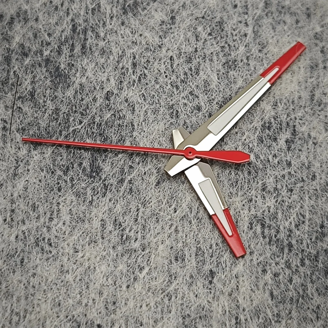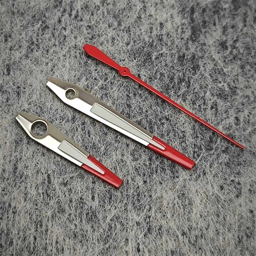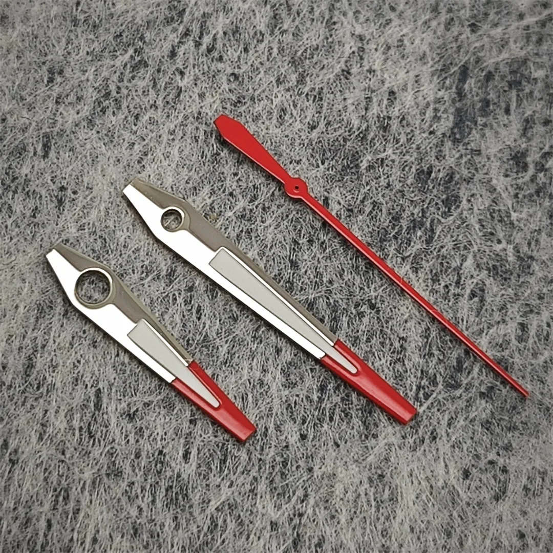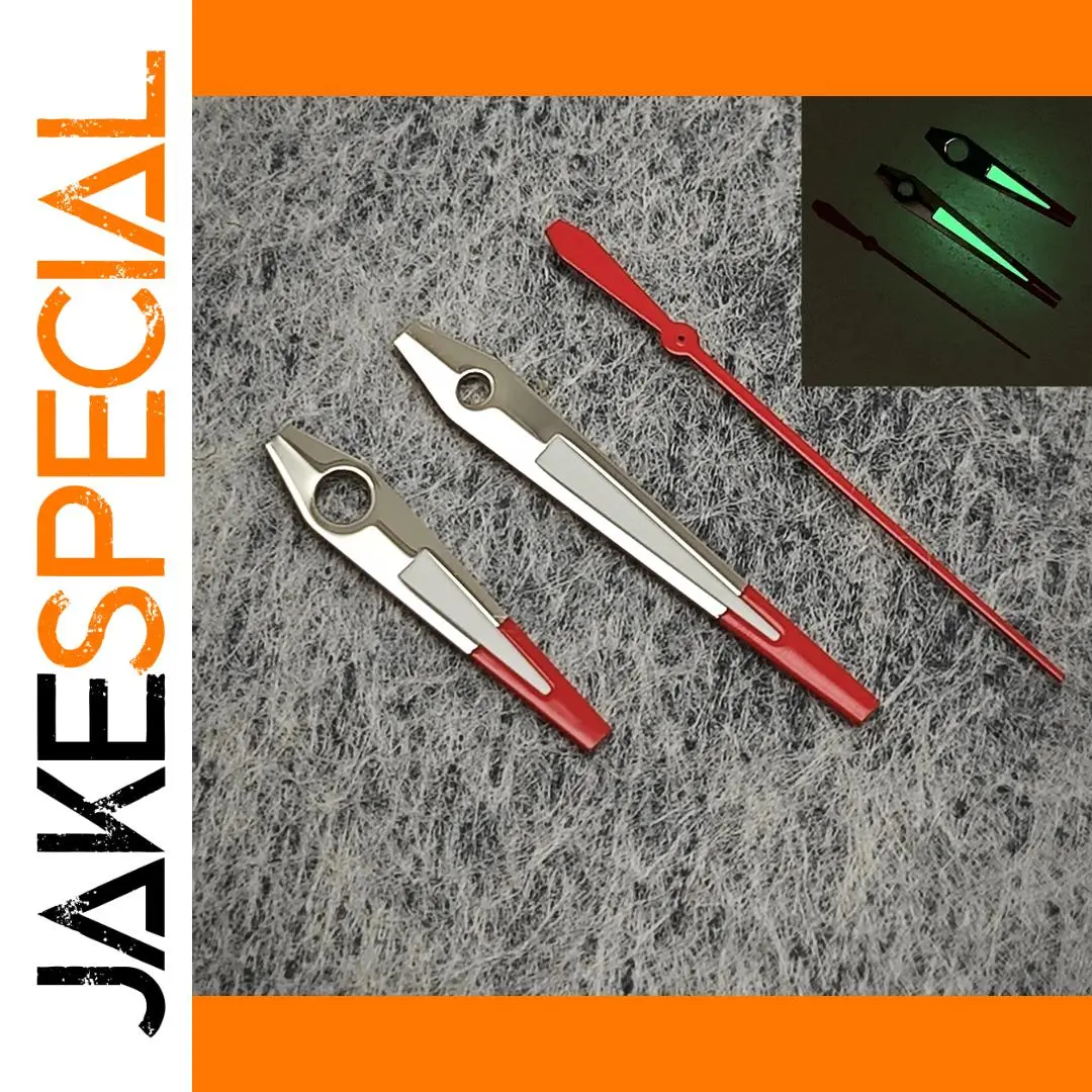 Transform your watch with this high-quality set of silver and red hands designed for NH35, NH36, 4R, and 7S mechanical movements. Crafted from polished stainless steel, these hands bring a sleek, modern aesthetic to your timepiece. The set includes a slender, bright red second hand measuring approximately 14.5 mm in length, perfect for a crisp, minimalist effect. The hour hand is a bold, arrow-shaped silver piece with a red accent, also measuring 14.5 mm, offering a robust look. The slightly shorter minute hand (around 10 mm wide) features a slim, tapered profile with red accents, adding elegance and clarity. The luminous green inserts allow for visibility in low light, combining functionality with style seamlessly. These hands are the perfect upgrade for a refined, contemporary watch.
