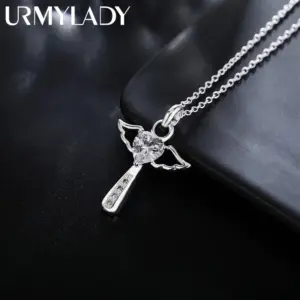 Experience timeless elegance with this unisex 925 Sterling Silver necklace weighing approximately 11 grams, featuring a stunning round crystal pendant in purple and white gemstone options. The pendant combines angelic and cross motifs, with delicate openwork wings surrounding the luminous crystal, and a slender vertical cross adorned with tiny sparkling stones hangs beneath. Crafted from high-quality sterling silver stamped with “925,” the 45cm (18-inch) link chain provides a refined, lightweight feel suitable for formal occasions such as weddings and parties. Certified by GDTC and REACH, this classic piece embodies sophisticated craftsmanship and versatile beauty, making it a meaningful accessory for any special event.