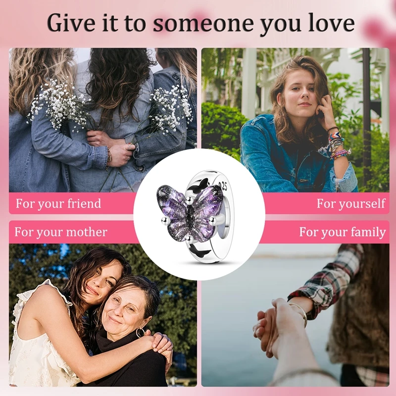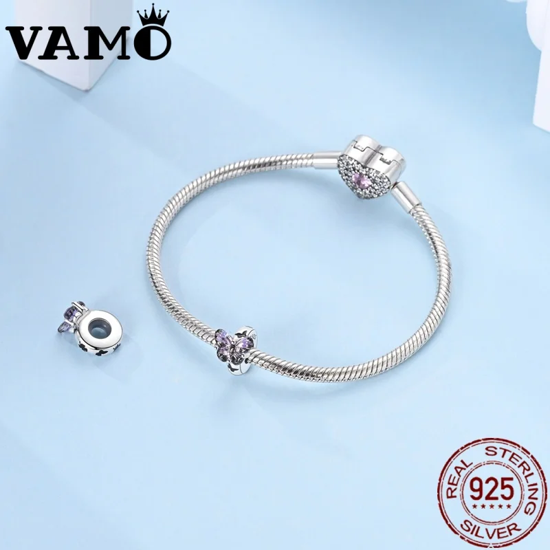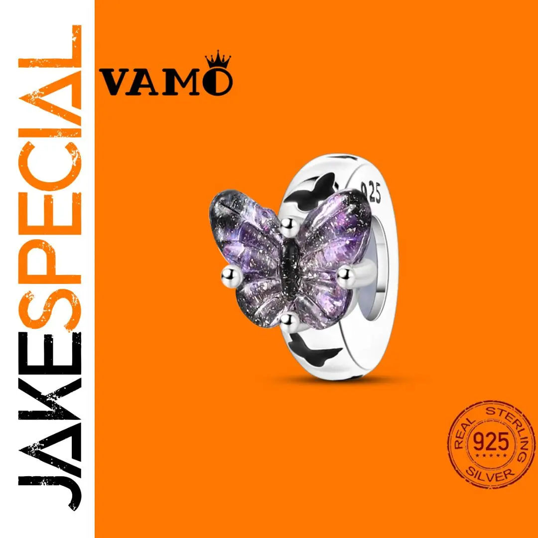 Enhance your jewelry collection with this exquisite VAMO 925 Sterling Silver charm bead, featuring a nugget-shaped design and a stunning purple butterfly clip pendant. Crafted from genuine silver with certification and adorned with sparkling zircon stones, this piece showcases a vibrant gradient of purple in the wings, embedded on a polished, circular surface marked with ‘925’ for authenticity. Its rubber fit ensures compatibility with original bracelets, making it perfect for DIY projects or a thoughtful gift. The butterfly motif adds a touch of fantasy and elegance, blending delicate beauty with playful charm, allowing you to express your unique style in every piece you create.