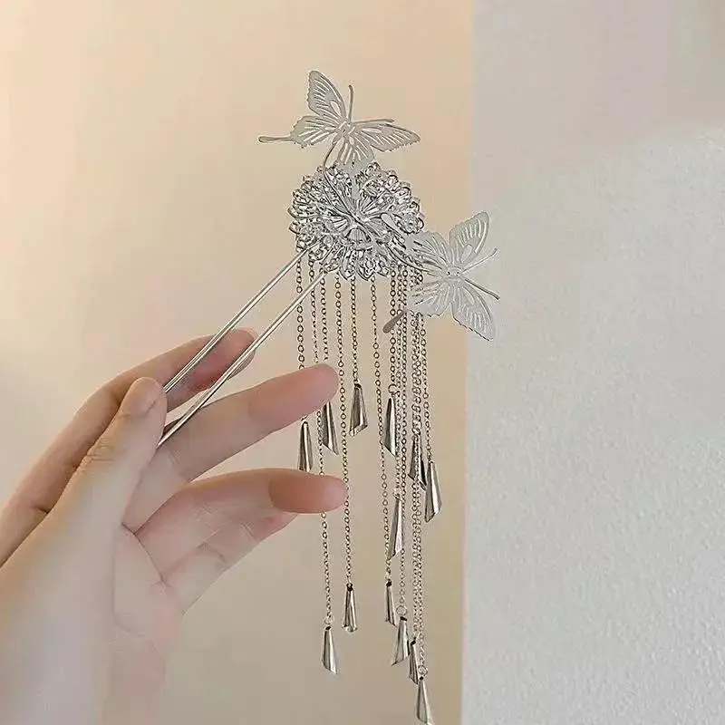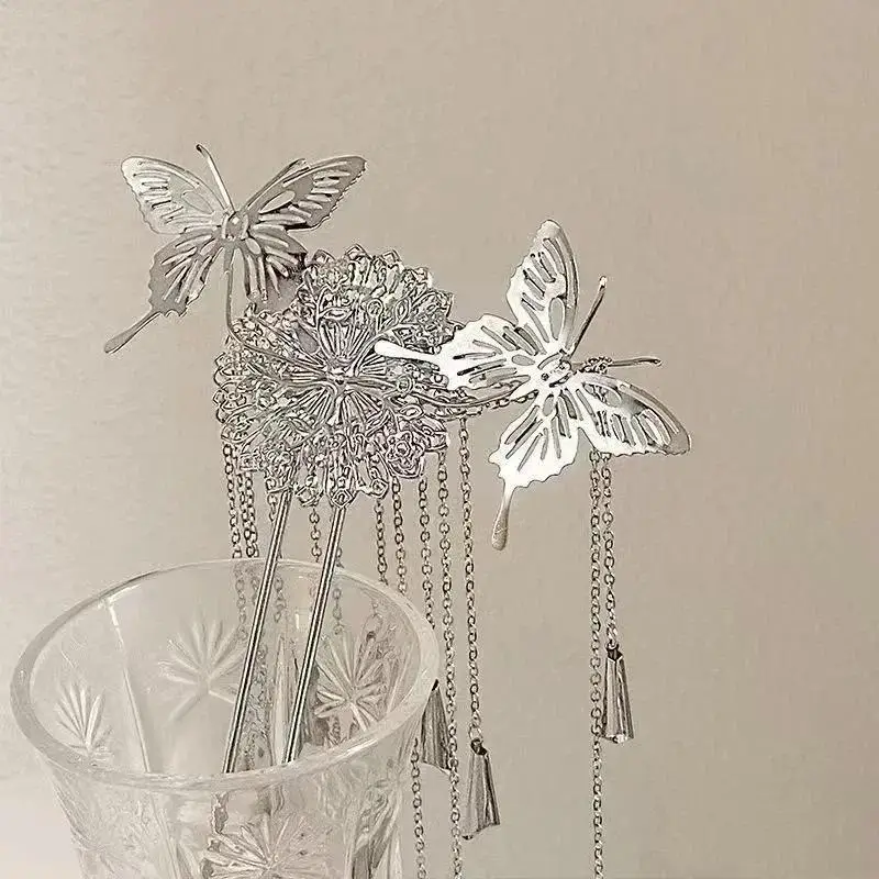 Elevate your look with this vintage-inspired silver butterfly and flower hairpin crafted from zinc alloy. Featuring intricate butterfly wing patterns, delicate floral details, and elegant long tassels, it adds a touch of sophistication perfect for weddings, parties, or special occasions. Designed for all-season wear, this ornate headpiece complements any adult woman’s hairstyle, bringing a layered, textured, and romantic aesthetic. Its refined craftsmanship ensures a stylish, decorative accessory that highlights your personal elegance. Whether worn as a statement piece or a subtle adornment, this exquisite hairpin offers timeless charm and versatile beauty, making it a memorable gift or a special treat for yourself.
