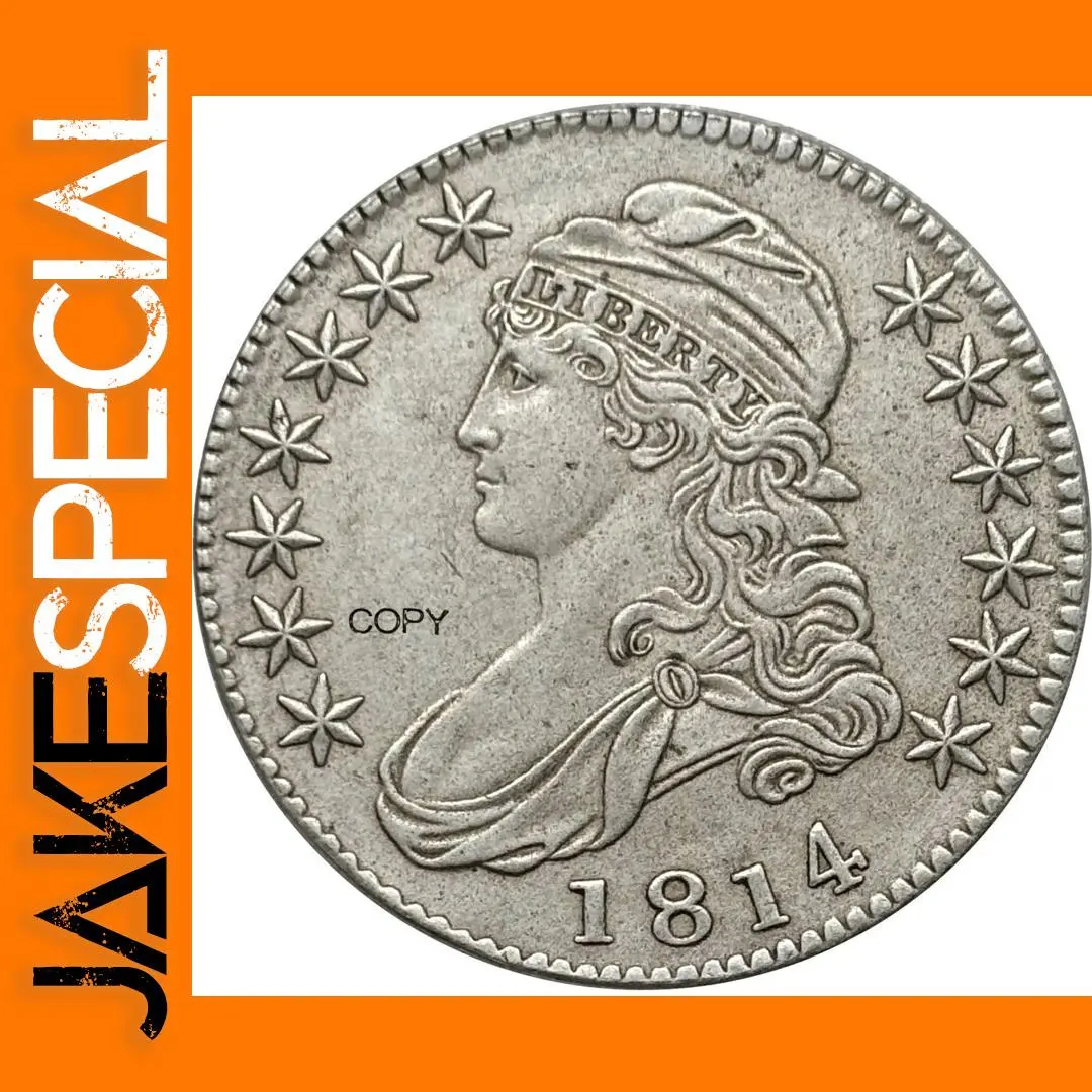 This silver-toned commemorative replica of the Capped Bust features a detailed profile of Lady Liberty facing left, wearing a cap inscribed with “LIBERTY,” and surrounded by thirteen six-pointed stars representing the original American colonies. Prominently displayed below her portrait are bold, raised numerals “1814,” emphasizing its historical significance. The piece boasts a reeded edge and a textured surface with a natural patina, giving it an authentic antique appearance that reflects early 19th-century craftsmanship. Crafted from high-quality metal, this collectible exudes durability and artistic detail, making it a perfect addition for history enthusiasts and collectors alike.