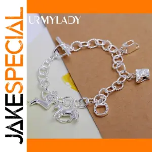 Imagine adding a touch of sophistication to your everyday style or an elegant accent for special occasions with this beautiful silver bracelet. Crafted from genuine 925 sterling silver, it boasts a polished, high-shine finish that reflects light beautifully. The chain link design features interconnected circular links, giving it a modern and trendy look. Dotted with charming accents—the detailed horse, smooth geometric horseshoe, and stylish umbrella-like charms—it’s a perfect blend of fashion and artistry. Weighing only 6 grams, this lightweight piece offers both comfort and elegance. Its uniform silver tone, stamped with the 925 hallmark for quality, makes it an ideal gift for loved ones or a personal treat to elevate your jewelry collection.