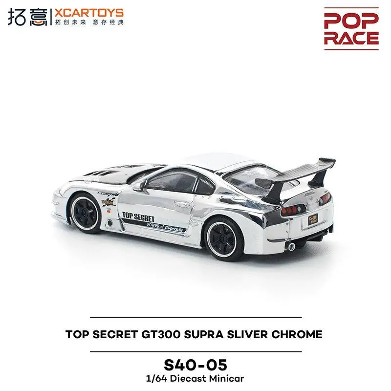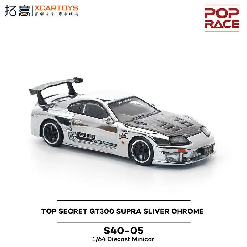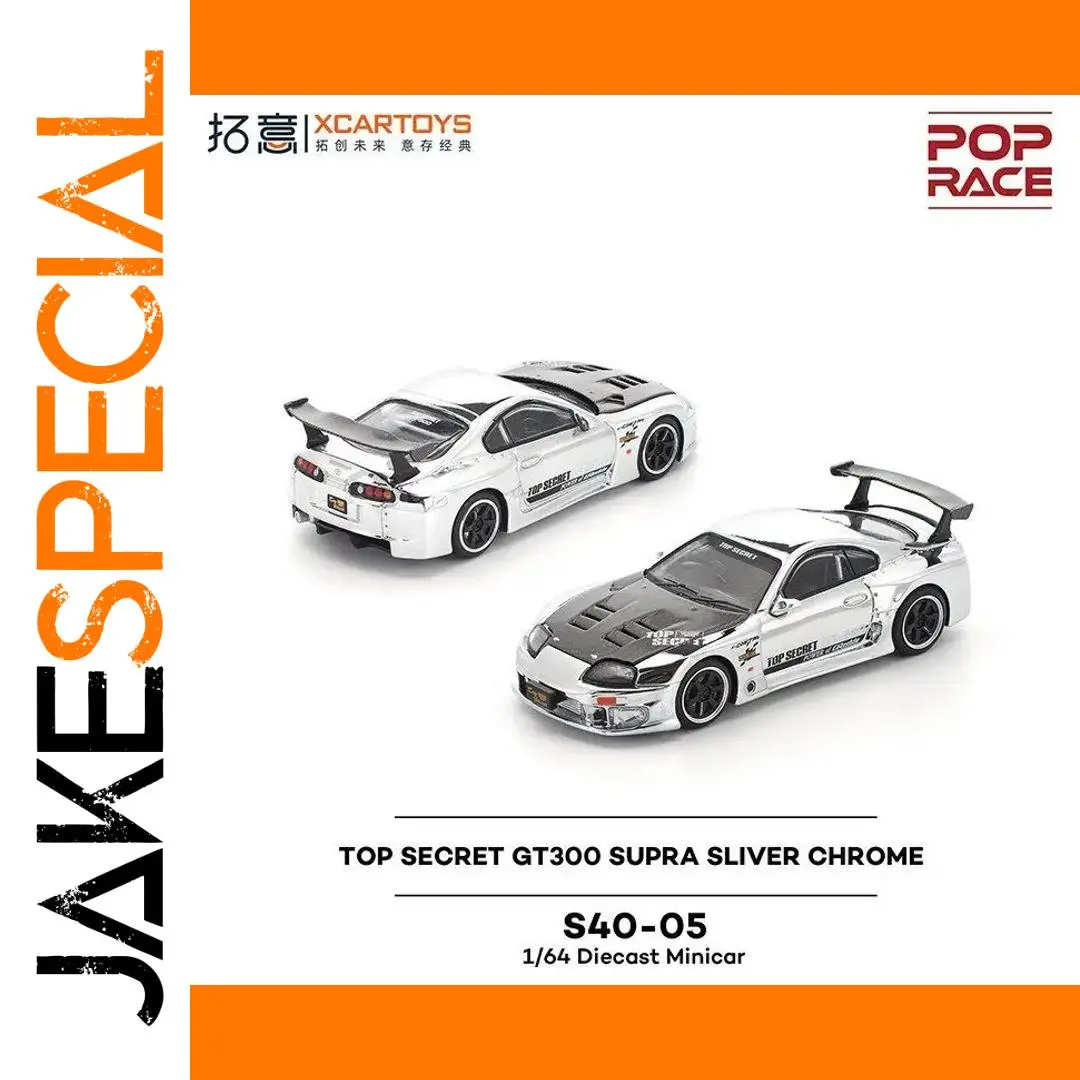 Immerse yourself in the sleek elegance of this 1:64 scale die-cast Toyota Top Secret GT300 Supra. Crafted from high-quality metal, this detailed model boasts a stunning reflective silver chrome finish that captures attention instantly. Its aerodynamic design features a low-profile body with smooth contours, a detailed front grille with air intakes, flush headlights, and vents on the hood, showcasing true racing aesthetics. The tinted side windows and contrasting black side mirrors elevate its visual appeal. The model includes decals with “TOP SECRET” branding and sponsor graphics, complemented by black multi-spoke wheels with low-profile tires. The prominent rear wing spoiler with support struts and detailed taillights underline its high-performance racing character. Perfect for collectors and enthusiasts alike.
