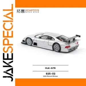 Experience the thrill of high-performance racing with this intricately detailed miniature of the iconic CLK-GTR supercar. Crafted with precision, this 1/64 scale diecast model boasts a sleek metallic silver finish (color code S25-02) that captures the car’s real-life glossy appearance. Its aerodynamic, low-profile design features smooth contours and a dynamic silhouette, perfectly embodying racing elegance. The prominent black rear wing on supports adds an aggressive touch, while the detailed multi-spoke rims wrapped in black tires with white lettering evoke a true racing spirit. Transparent windows showcase a detailed interior with racing seats and a steering wheel, giving added realism. Overall, this model embodies craftsmanship and speed, making it an attractive piece for collectors and enthusiasts alike.