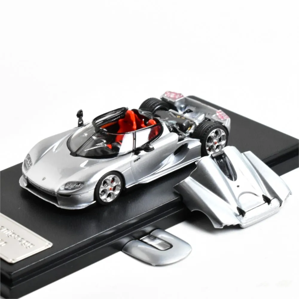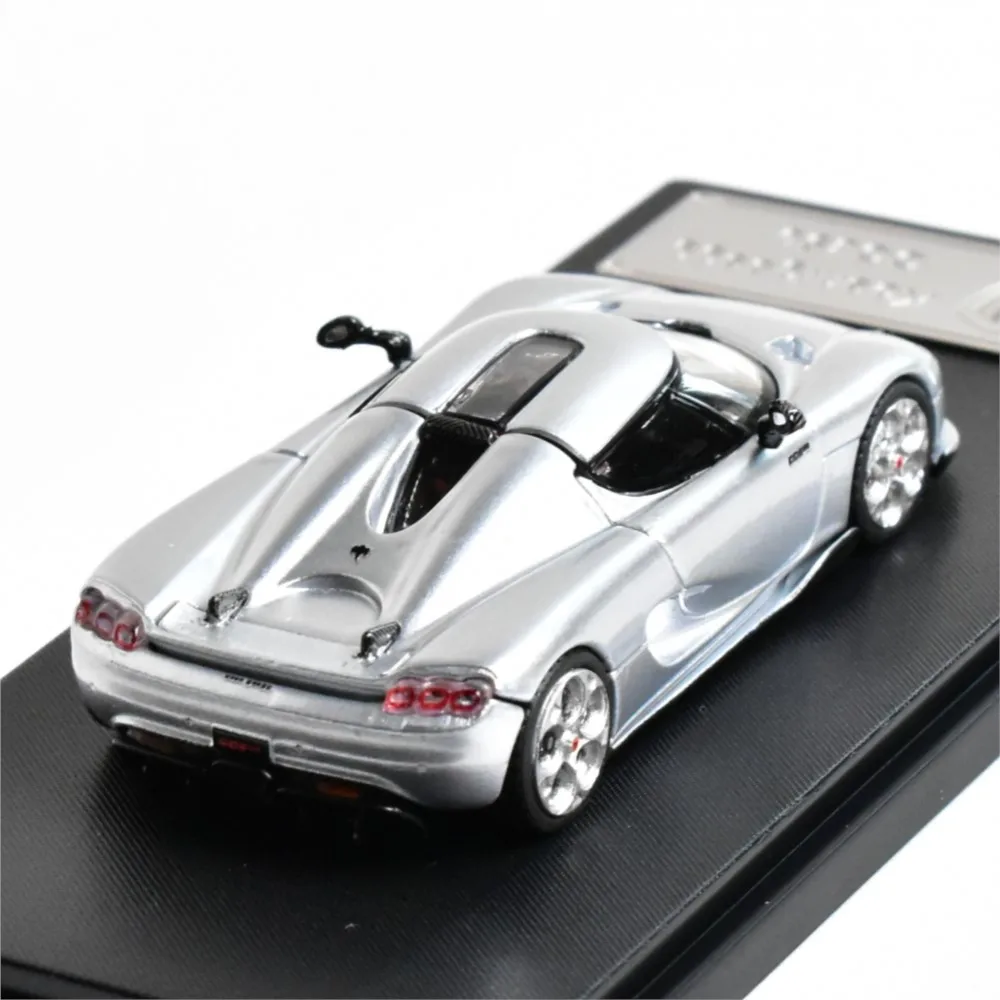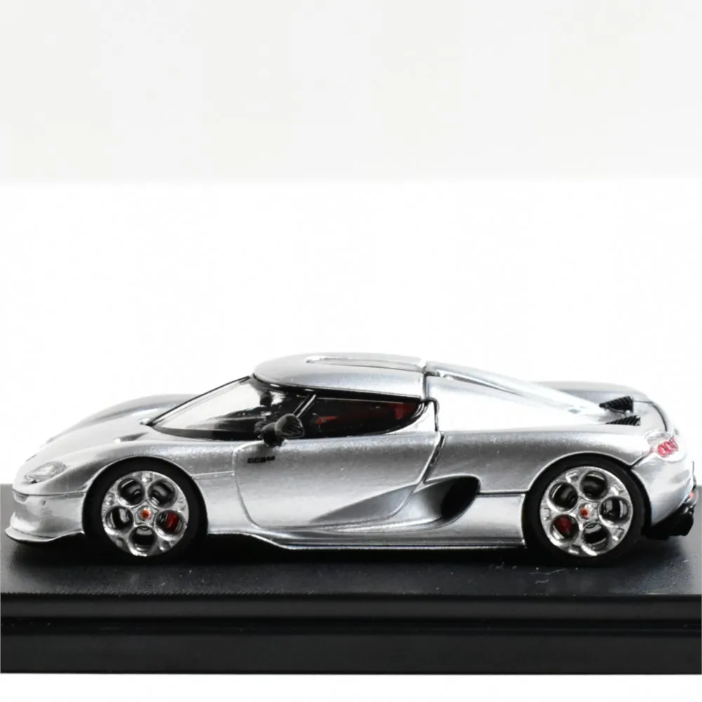 Experience the thrill of owning this meticulously crafted diecast model car, scaled at 1:64. Its sleek silver finish and aerodynamic shape evoke the essence of high-performance racing cars, perfect for passionate collectors. The smooth, flowing curves and reflective metallic surface highlight precise craftsmanship and attention to detail. Features like sculpted side lines, integrated vents, and a contoured roofline enhance its realistic appearance. The model’s small, black side mirrors and antenna add subtle accents, while the multi-spoked, metallic wheels with red hub details bring a striking contrast to the black treaded tires. Mounted on a sleek display base, this collectible superbly captures the spirit of speed and sophistication, making it an ideal addition to any collection of fine diecast vehicles.