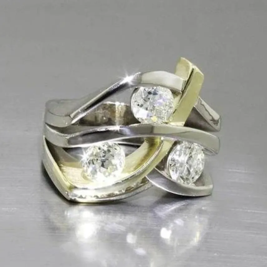 Imagine adding a touch of modern elegance to your outfit with this eye-catching cocktail ring. Crafted from durable zinc alloy, it features a sleek, geometric design created by overlapping polished bands in silver and gold-tone accents. The layered, dynamic shape offers a contemporary flair perfect for special occasions such as parties, engagements, or weddings, yet versatile enough for daily wear. The centerpiece showcases five clear prong-set stones that catch and reflect light beautifully, enhancing its glamorous appeal. Its adjustable design makes it suitable for all finger sizes, ensuring comfort and elegance at any event. Elevate your jewelry collection today with this trendy, fashionable piece that exudes sophistication and modern style, making every moment memorable.