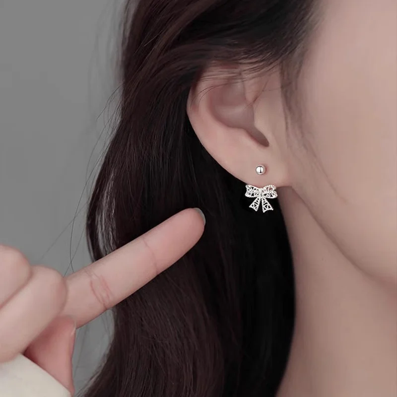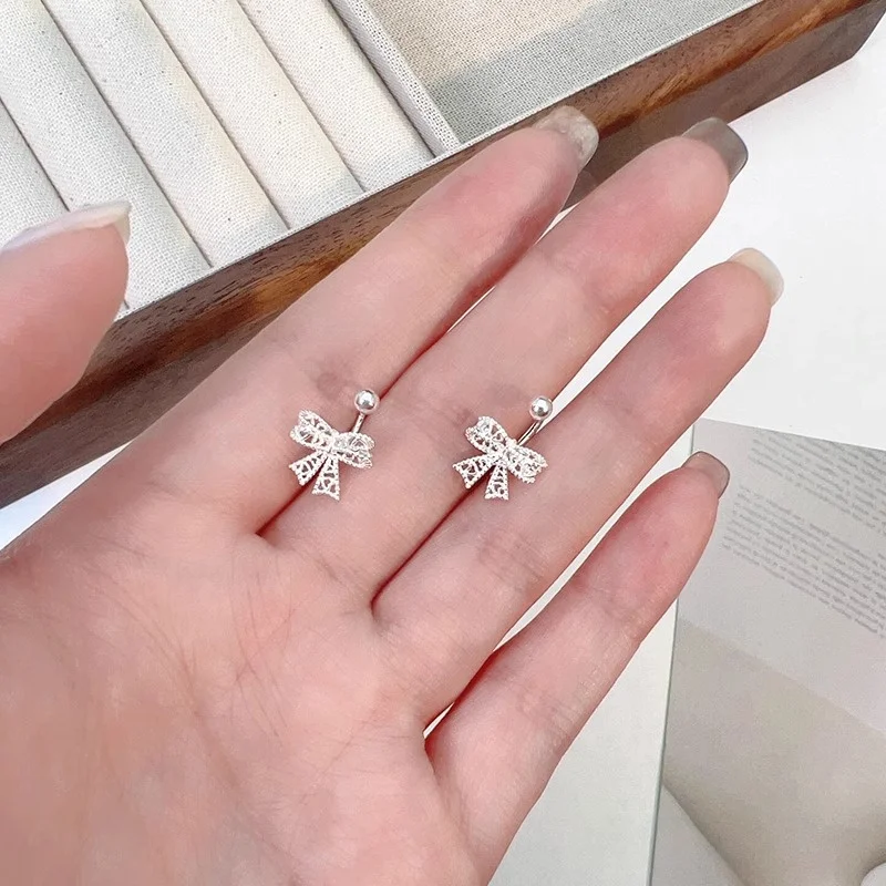 Experience the elegance of these delicately crafted stud earrings made from copper alloy with a silver-colored finish. Featuring a lace heart hollow bow design, each earring showcases intricate openwork patterns that exude femininity and sophistication. The small, rounded bowknot adds a touch of charm, while the push-back fastening ensures a secure fit. Perfect for women seeking a cute, romantic accessory, these fashion jewelry pieces effortlessly combine refined style and everyday elegance. Enhance your look with this refined accessory, designed to add a subtle yet charming touch to any outfit, making them a versatile addition to your collection.