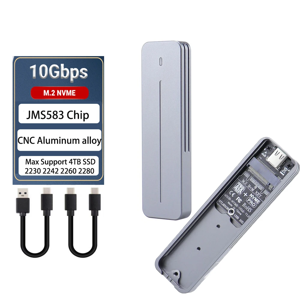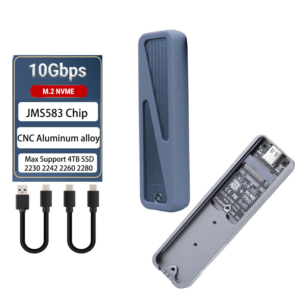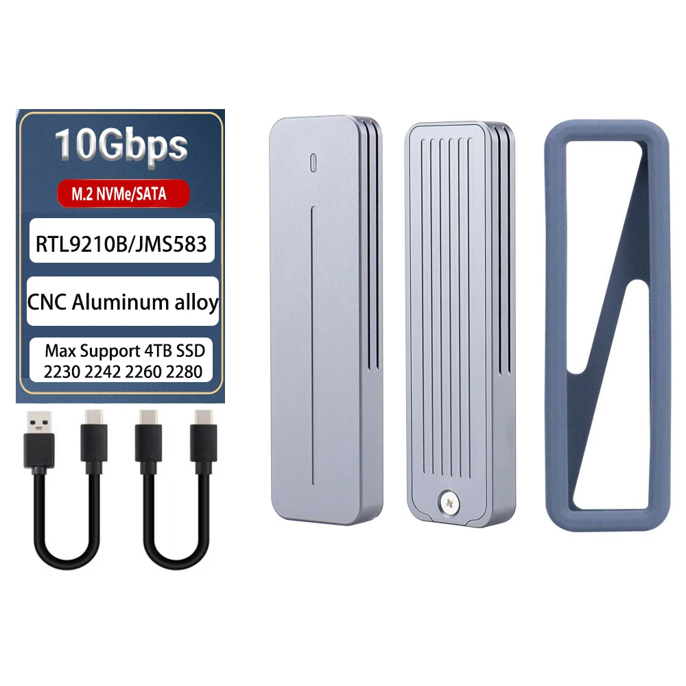 Experience sleek portability with this all-metal silver M.2 SSD enclosure designed for ultimate durability and style. Measuring just 106mm x 31mm x 10mm, it fits comfortably in your pocket or bag, making data transfer and storage on the go effortless. The minimalist matte finish highlights its refined, contemporary look, complemented by a discreet LED indicator for status updates. Featuring dual controllers—RealTek RTL9210B and JMS 583—this enclosure supports both NVMe PCIe M key and M+B key SATA SSDs, compatible with sizes 2230, 2242, 2260, and 2280. Its high-speed USB 3.2 Gen2 Type-C interface ensures up to 10Gbps transfer speeds, while the included heatsink pad and shock-absorbing bumper optimize heat dissipation and protection. Trust in this elegant, reliable solution for your data management needs.