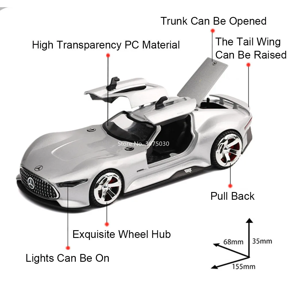 Experience the thrill of owning a highly detailed 1:32 scale diecast model of the Mercedes-Benz GT in striking silver or sleek black. Crafted with a zinc metal body, plastic chassis, and rubber tires, this high-simulation vehicle measures approximately 15.5 x 6.8 x 3.5 cm and features functional doors that open, along with realistic sound and light effects. The pull-back motor allows for smooth, effortless movement, making it an ideal collectible or gift for enthusiasts aged 14 and above. Designed for durability and precision, this miniature replica captures the luxury and sporty elegance of the original car, offering a premium addition to any collection.