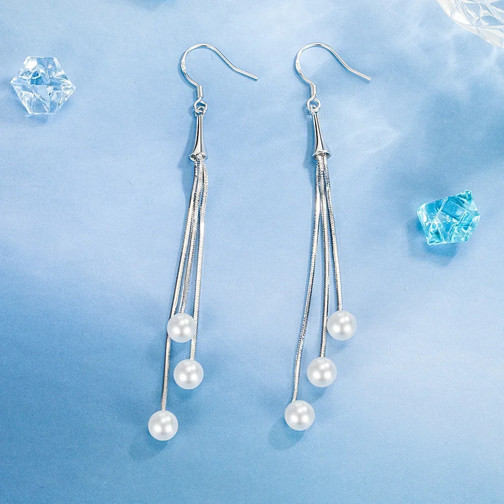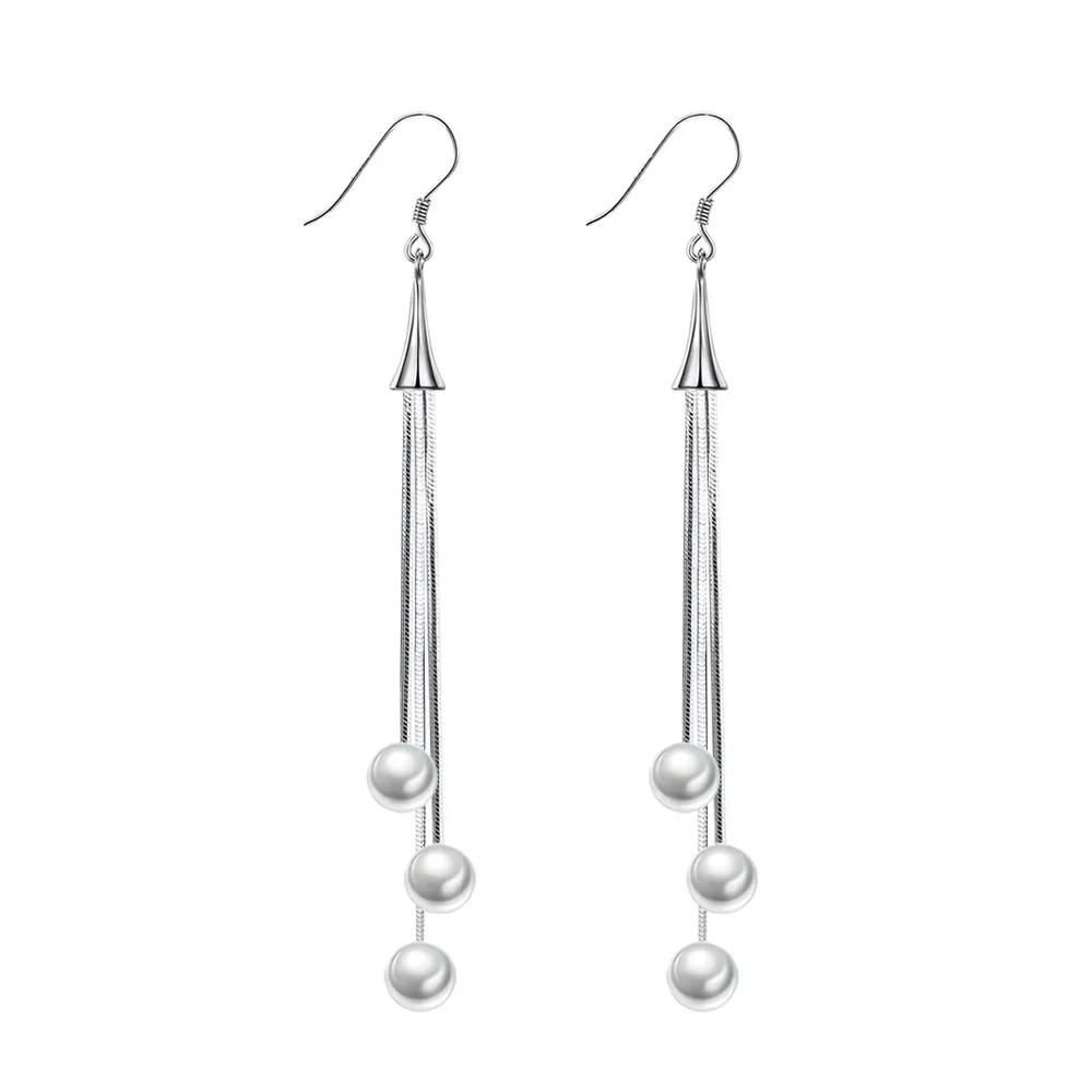 Imagine elevating your style with these stunning tassel sterling pearl drop earrings, designed to bring a touch of modern elegance and timeless charm to any outfit. Crafted from 925 sterling silver with a shiny, silver-colored finish, each earring features a sleek conical body that widens slightly at the top and is adorned with dazzling cubic zirconia gemstones. From the tapered top, delicate, straight metal strands cascade down, ending with three beautifully round, white pearls of increasing size at the bottom, creating a sophisticated and graceful dangling effect. Perfect for weddings, anniversaries, birthdays, or as a special gift, these earrings blend classic pearls with contemporary design, making you stand out confidently wherever you go.