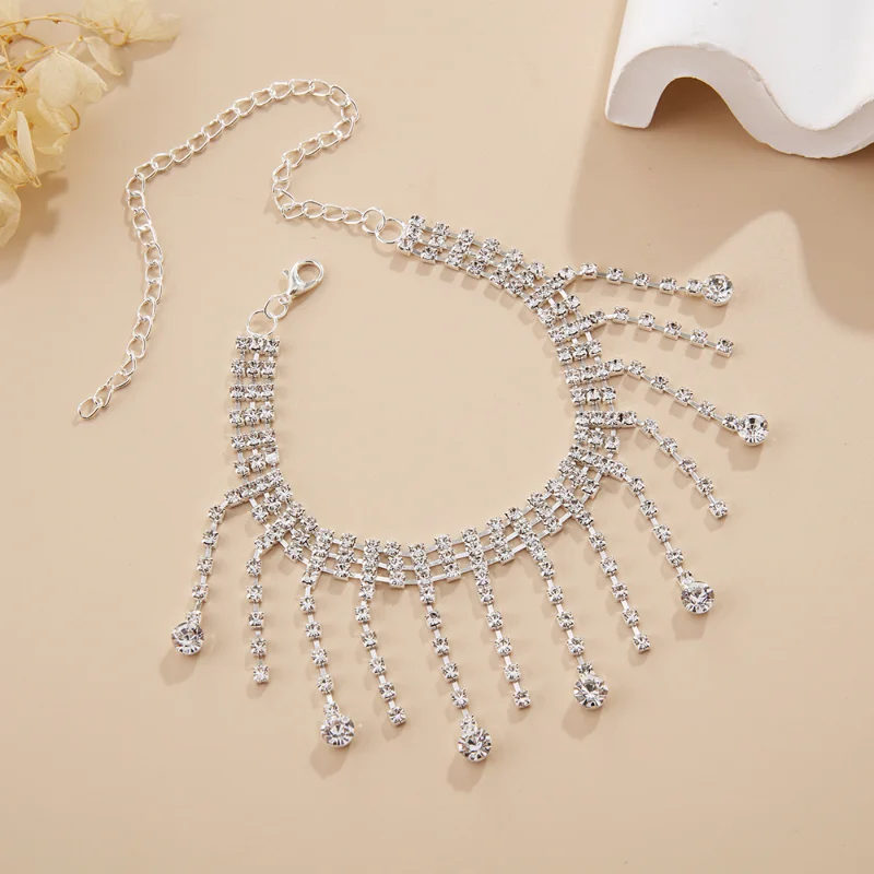 Immerse yourself in elegance with this exquisite silver anklet, designed to elevate your style for summer, beach outings, or special occasions. Featuring a trendy double-layer construction, it showcases a delicate, horizontal chain adorned with sparkling cubic zirconia stones. Dangling water droplet-shaped strands with varying lengths create a dynamic, textured look that catches the light beautifully. The shiny silver finish enhances its modern and sophisticated appeal, seamlessly blending fashion with comfort. Crafted from durable zinc alloy and glass materials, this anklet offers lightweight wear without sacrificing quality. Its secure fit contours perfectly around your ankle, making you feel confident and stylish wherever you go. You will love how this piece complements your bare skin and enhances your natural beauty.