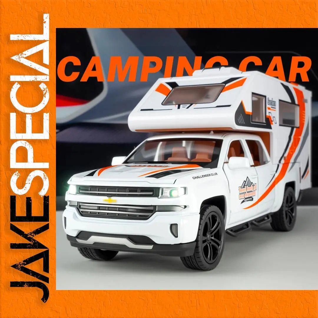 This exquisite 1:32 scale diecast alloy model of the Silverado Recreational Vehicle offers a captivating blend of style and functionality, making it an ideal collectible for enthusiasts. Finished in a striking white with vibrant orange and black accents, this model is designed to stand out. It features an intricately detailed front with a Chevrolet logo, horizontally lined grill, and realistic LED-like headlights. The sleek camper shell with its smooth curves houses a detailed interior, while black rims and textured rubber tires add to its sporty charm. Perfect for display or play, it's a must-have for any collector's shelf!