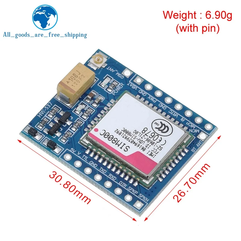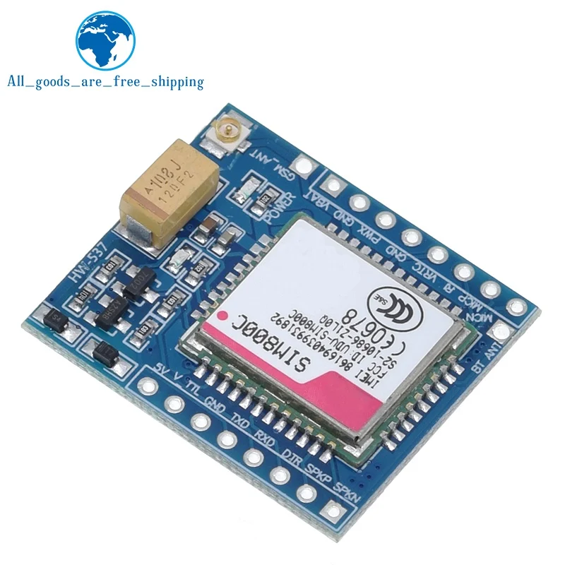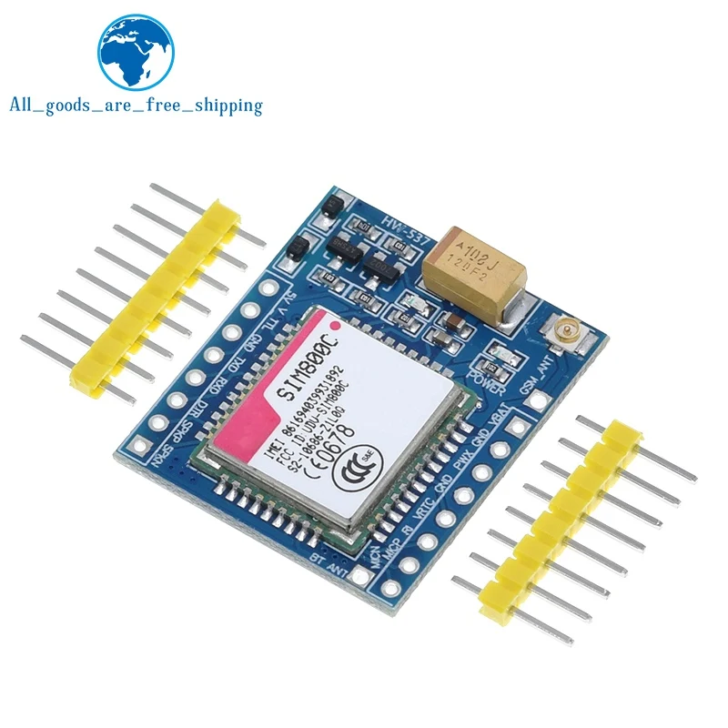 Enhance your electronic projects with this TZT SIM800C GSM GPRS Module, compatible with 5V and 3.3V supply voltages and supporting TTL communication. Featuring a sleek blue rectangular PCB with a white SIM card-sized module, metallic antenna area, and bright yellow single-pin connectors, this module combines industrial design with practical functionality. Designed for DIY enthusiasts, it operates across a broad temperature range from -40°C to +85°C, making it ideal for computer, switching, and sensor applications. Available in packages of 1 or 3 pieces, this new, customizable module offers reliable performance and seamless integration for your electronic system needs.