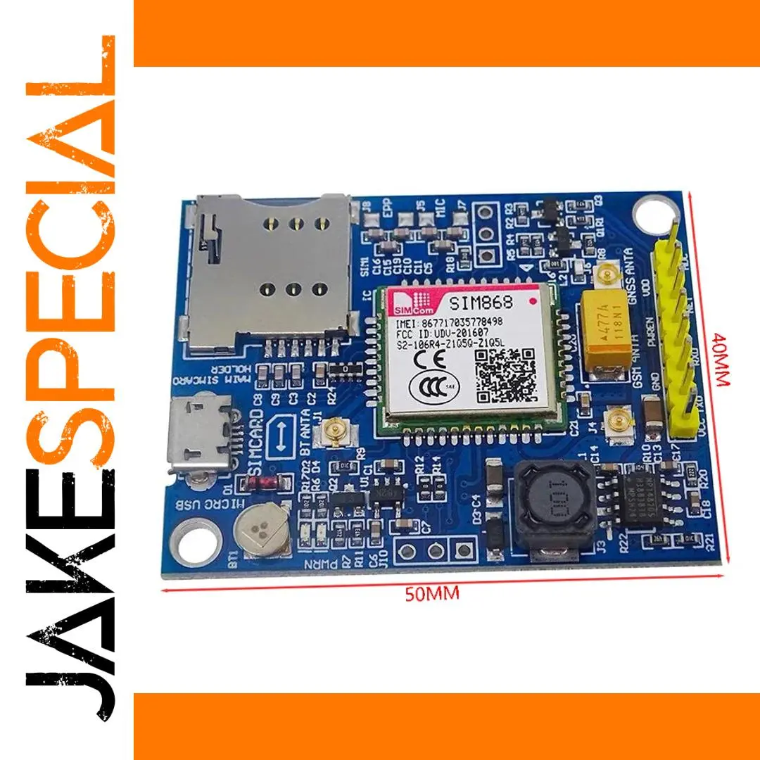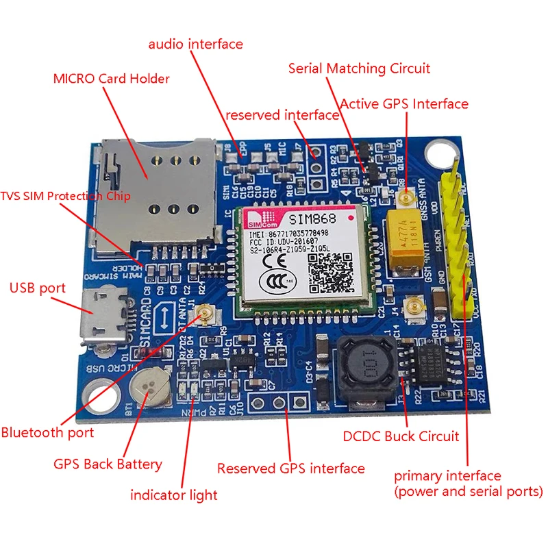 - Supports GSM, GPRS, Bluetooth, and GPS functionalities via a central SIM868 module with clear labeling for easy identification.