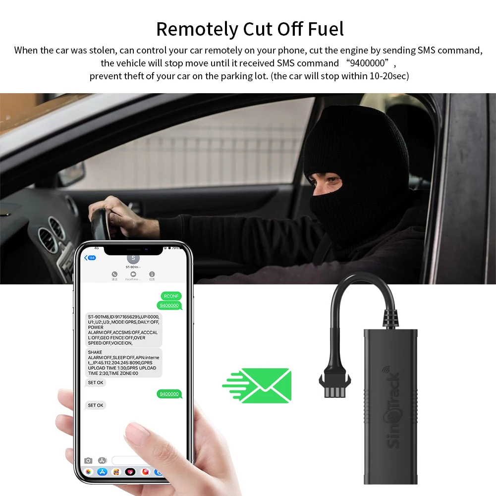The SinoTrack Mini GPS Tracker ST-901M is an essential vehicle tracking device for cars and motorcycles, designed for reliable performance with a 12V power supply. This compact unit operates on a GSM quad-band frequency and features a GPS module that enables real-time location tracking via SMS/GPRS. While it lacks a built-in battery with a battery life of 1 to 4 hours in use, the tracker includes ignition detection (ACC), authorized number settings, overspeed alarms, and data-saving intervals. Users can connect an external relay for controlling oil and circuits, and it syncs seamlessly with a free mobile app on iOS and Android, with no subscription fees required.