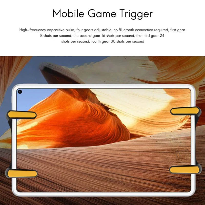 Experience heightened control and precision with this sleek, black six-finger mobile game trigger controller. Designed for serious gamers, it combines ergonomic comfort, responsive triggers, and durable materials to enhance your gameplay on tablets and smartphones. The streamlined curved handles measure approximately 100mm in length, 37mm in width, and 54mm in height, fitting comfortably in your hands for extended gaming sessions. The controller's matte ABS+PC finish provides a smooth yet sturdy grip. Large metallic silver alloy trigger buttons deliver a mechanical feel, tested over 584,000 presses for reliability. A prominent yellow sliding button offers quick adjustments. Its six-finger linkage and lifting buckle ensure seamless, multi-finger input without blocking the screen. The lightweight design, totaling about 60 grams, makes it portable for gaming on the go.