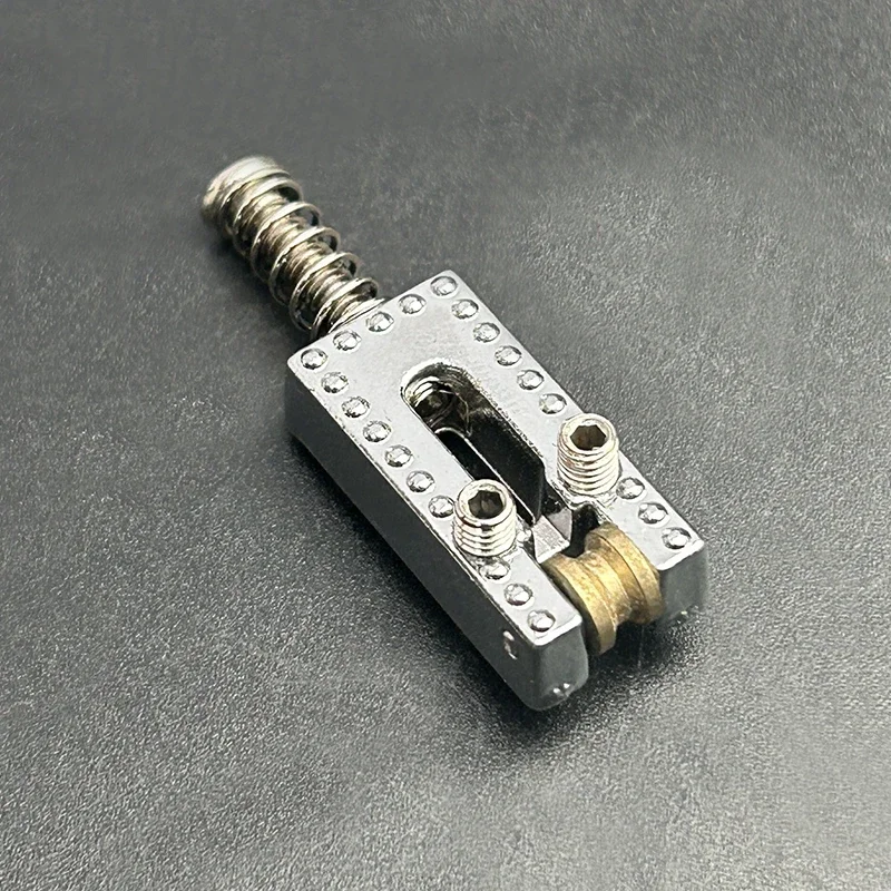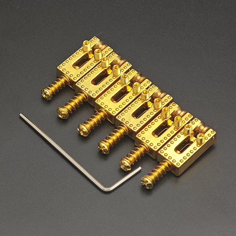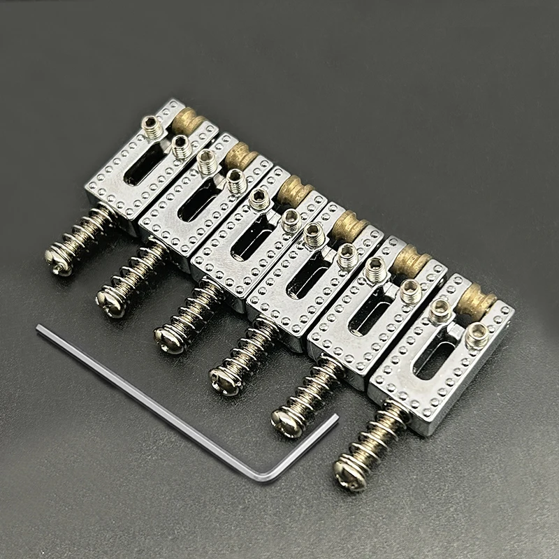 Experience smoother playability and enhanced tone with this high-quality set of six rolling string saddles for electric guitars. Crafted from durable zinc and brass, these saddles feature a sleek, minimalist design with evenly spaced circular holes and prominent dot details for precise string positioning. Available in stylish chrome, matte black, or elegant gold finishes, they seamlessly blend with a variety of guitar styles. Measuring 10.5×21.5mm, each saddle offers a perfect fit for standard guitar bridges, ensuring stability and performance. Whether you're customizing your instrument or replacing worn components, this set provides consistent quality and a refined look that elevates your playing experience. Enjoy a professional upgrade with these meticulously crafted saddles.