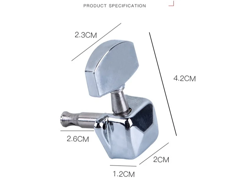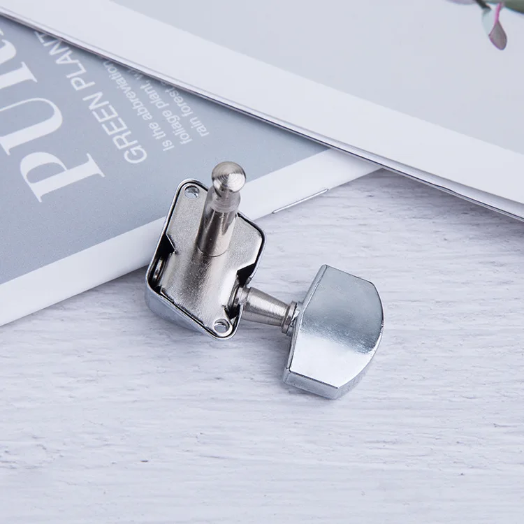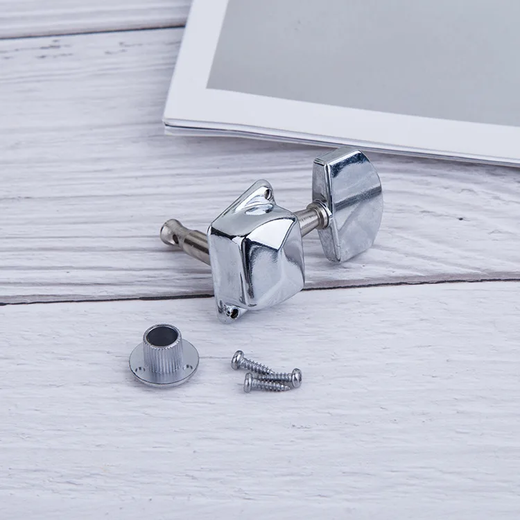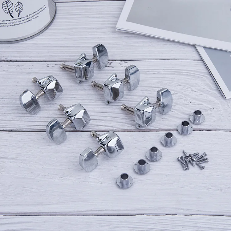 Enhance the look and function of your acoustic guitar with this set of six precisely crafted metal tuning knobs. Each knob features a sleek, rectangular shape with gentle curves, providing a modern and minimalist aesthetic. The shiny, electroplated silver finish offers excellent durability and a high-gloss surface that reflects light beautifully, adding a touch of sophistication to your instrument. Designed for universal use, these knobs fit standard guitar tuning mechanisms, making them an ideal replacement or upgrade for your acoustic guitar. The set’s uniform size and polished appearance ensure a consistent, professional look across all six tuning pegs. Easy to install, they promise both style and reliable tuning stability, giving you a smoother playing experience while elevating your instrument’s visual appeal.