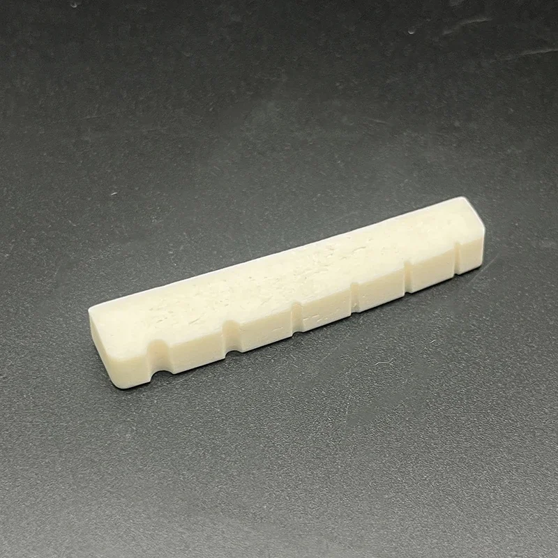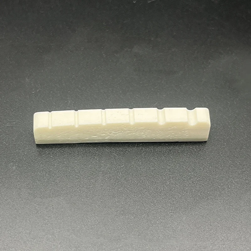 Transform your 6-string bass guitar with this set of ten premium bone nuts, crafted from natural cattle bone. These components are designed to provide exceptional sustain and tonal clarity, enhancing your instrument’s performance. The white, polished surface reveals subtle natural grain and slight textural variations, highlighting their authentic craftsmanship. With a sleek, rectangular shape and evenly spaced grooves, these nuts offer precise string positioning for smooth playability. Measuring 52x6x9.3/8mm, they fit most standard bass guitars, providing a reliable upgrade or replacement for worn or damaged parts. Better tone, improved sustain, and a natural aesthetic—these bone nuts help you achieve the professional sound you seek.