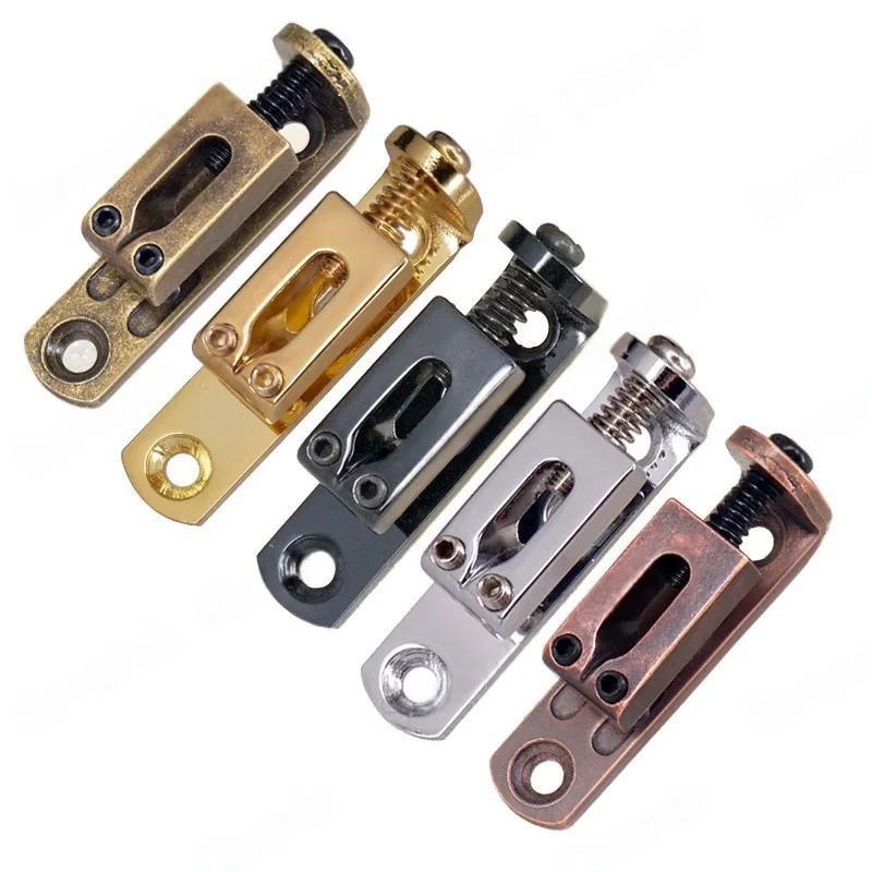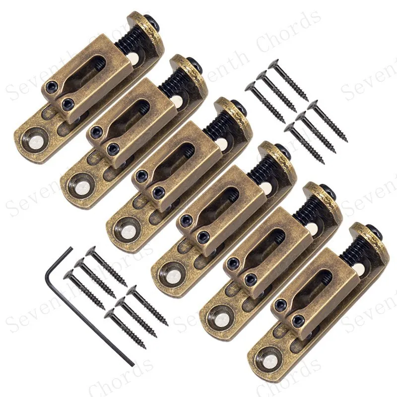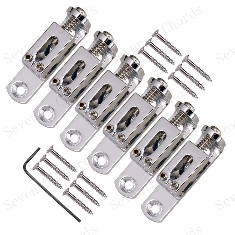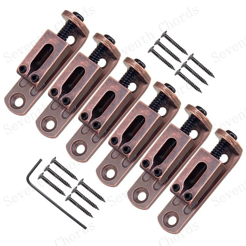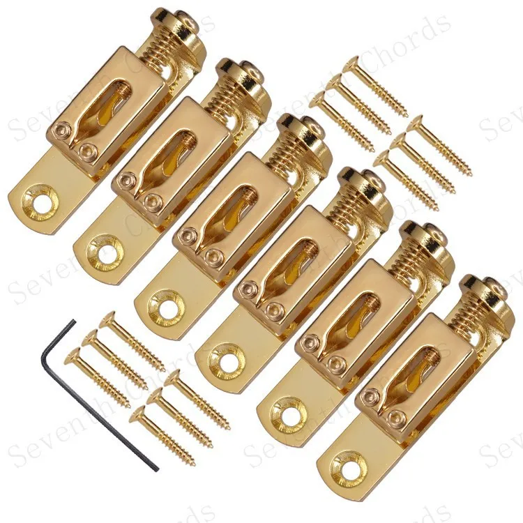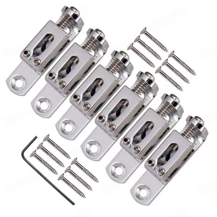 Enhance your guitar’s performance with this set of six single split electric guitar bridge tailpiece saddles crafted from durable zinc alloy. Available in sleek black, shimmering silver, classic gold, and two stylish bronze options, each saddle features a smooth matte finish with rounded edges and a central elongated slot for precise string placement. Included are six matching screws and a mini adjustment wrench for easy installation and fine-tuning. Designed for stability and a modern minimalist aesthetic, this set provides a reliable upgrade for compatible guitar models, ensuring optimal sound and tuning stability. Perfect for guitar enthusiasts seeking quality replacement parts.