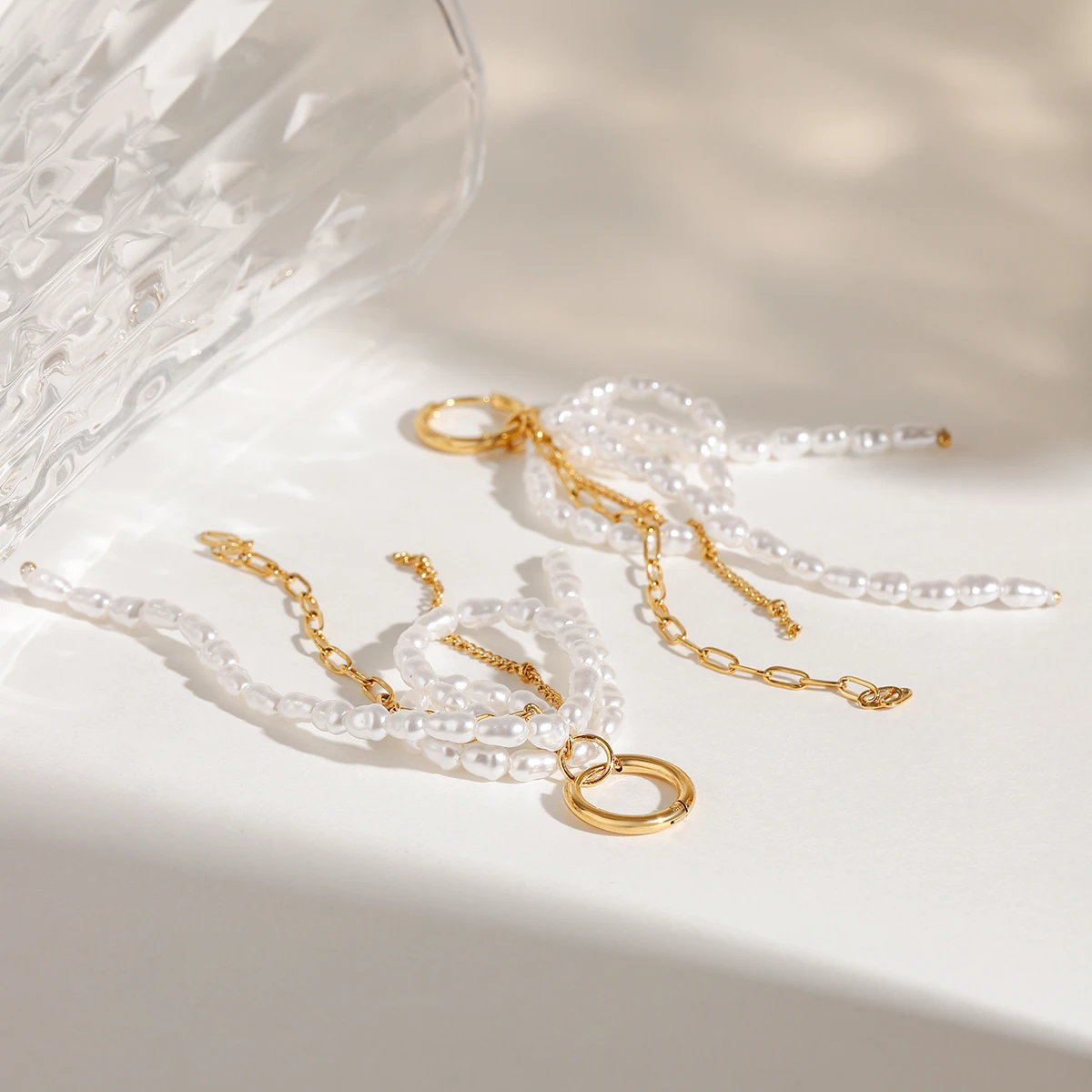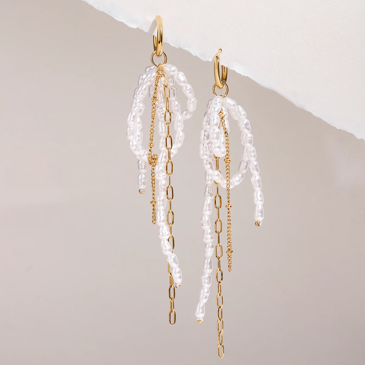 These stainless steel earrings, model number JDEW2411004, feature a striking skeleton-shaped silhouette with a lightweight, breathable design. Cascading strands of elongated oval-shaped imitation pearls shimmer with movement, while delicate gold-colored chains of varying lengths and link styles add texture and dimension. Crafted for durability and comfort, these hypoallergenic earrings resist tarnish and corrosion, making them ideal for sensitive skin. The contemporary yet elegant style effortlessly elevates any outfit, perfect for both casual and formal occasions. Experience the blend of modern fashion and timeless sophistication with these versatile statement earrings, designed to enhance your jewelry collection and complement your unique style.