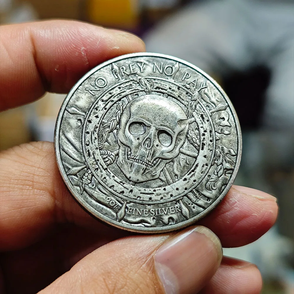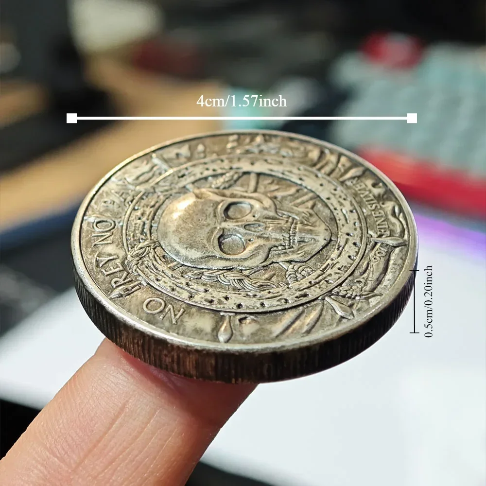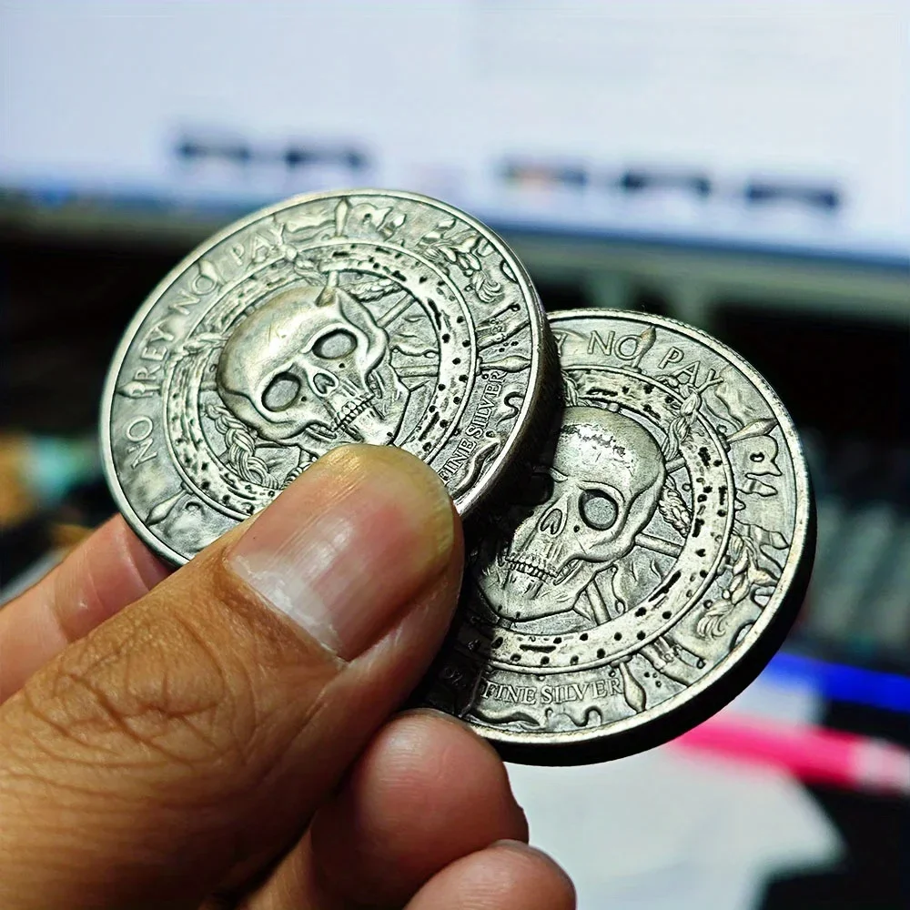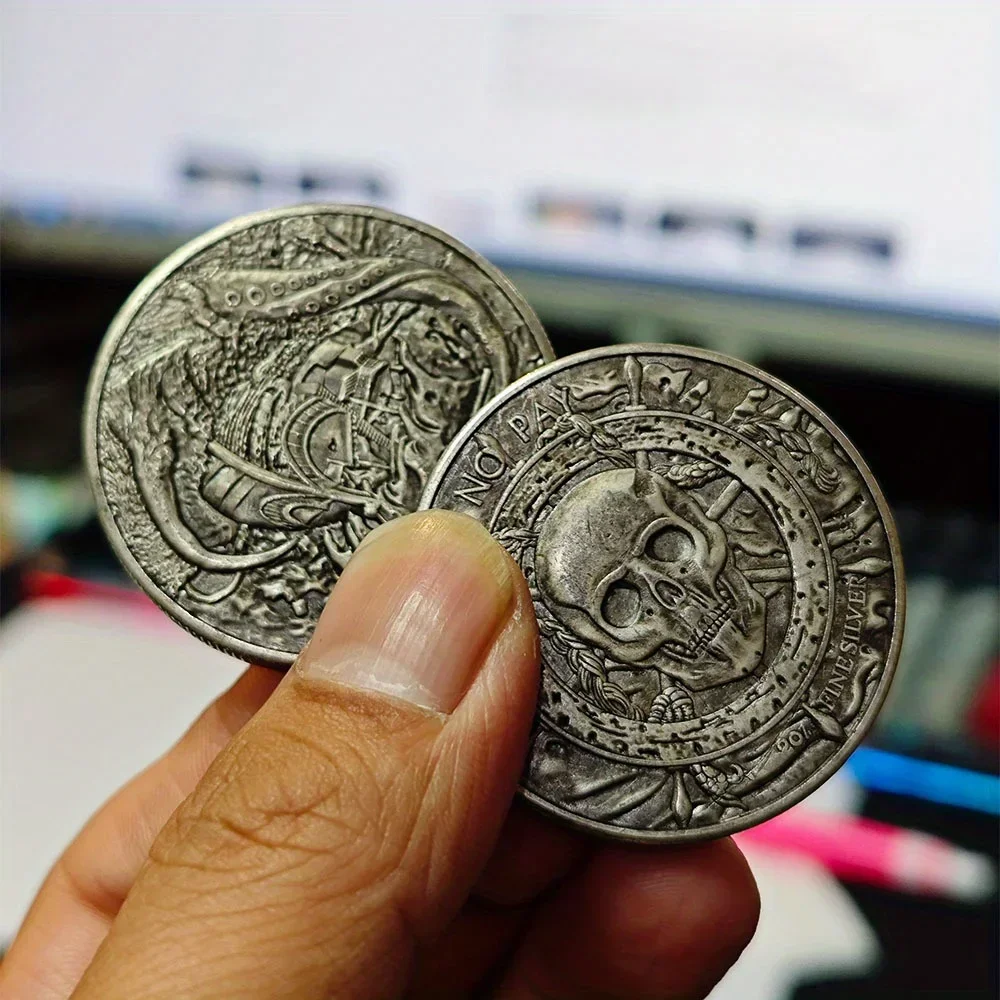Discover the striking appeal of this this Skeleton Pirate Ship Silver crafted from durable, high-quality metal in a light grey hue. Its intricate embossed skull design, with hollow eye sockets and a detailed nose cavity, delivers a bold, pirate-inspired aesthetic. Surrounding the skull, nautical elements such as ropes and ship parts enhance the maritime theme, while the textured surface and vintage finish evoke an aged, collectible charm. Perfect for display or gifting, this piece brings a touch of adventure and gothic flair to any space. Its compact size makes it a versatile decorative object that will spark conversations and admiration. Embrace your passion for pirate lore with a collectible that embodies both craftsmanship and character.