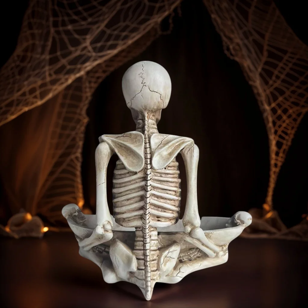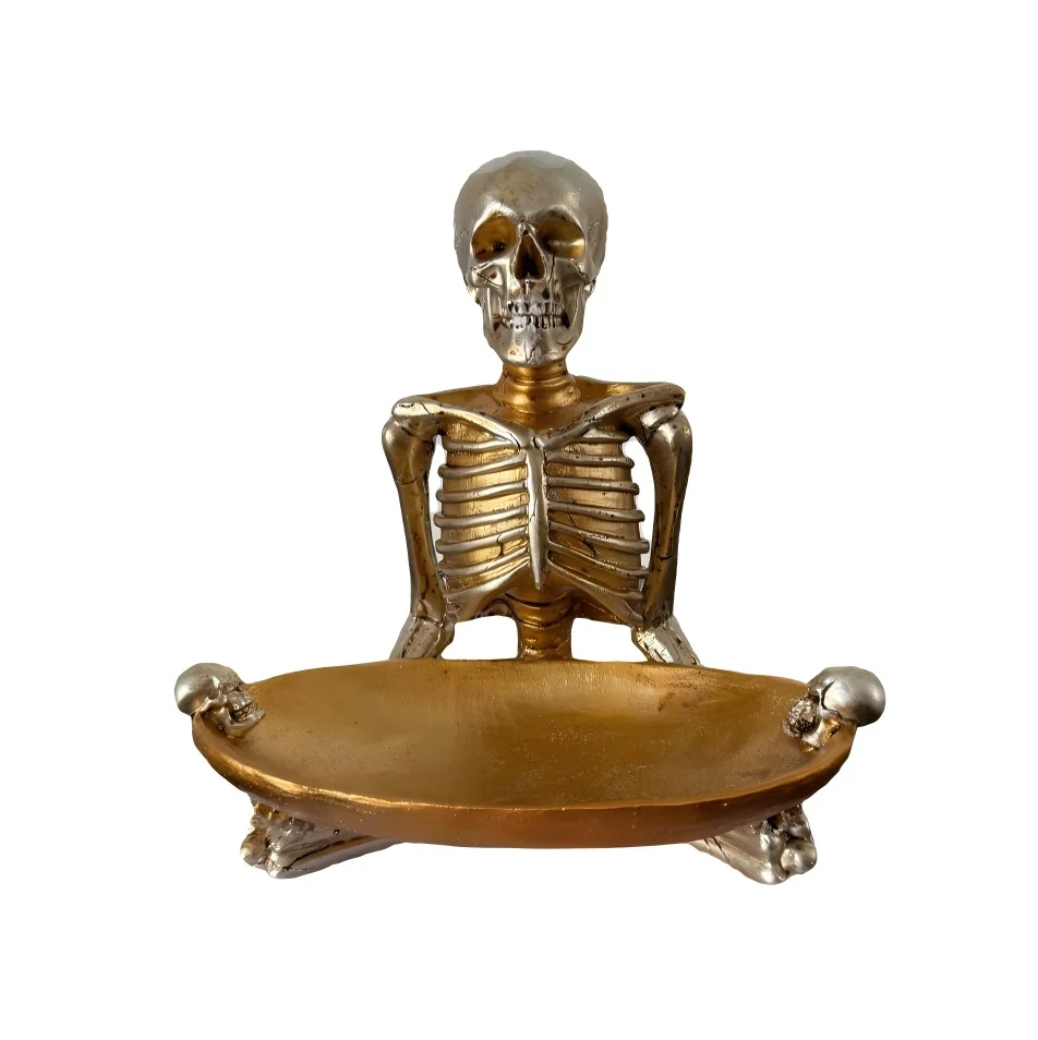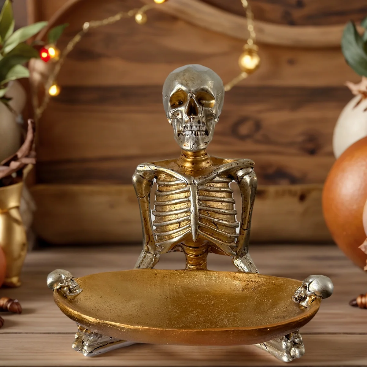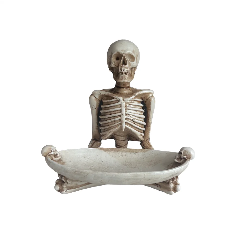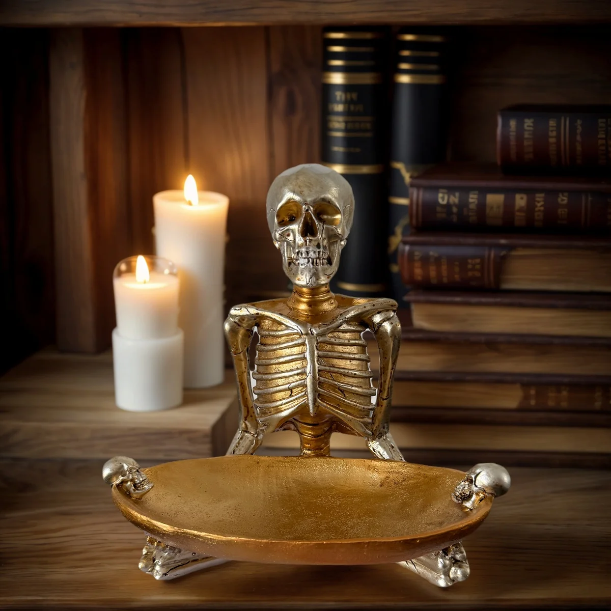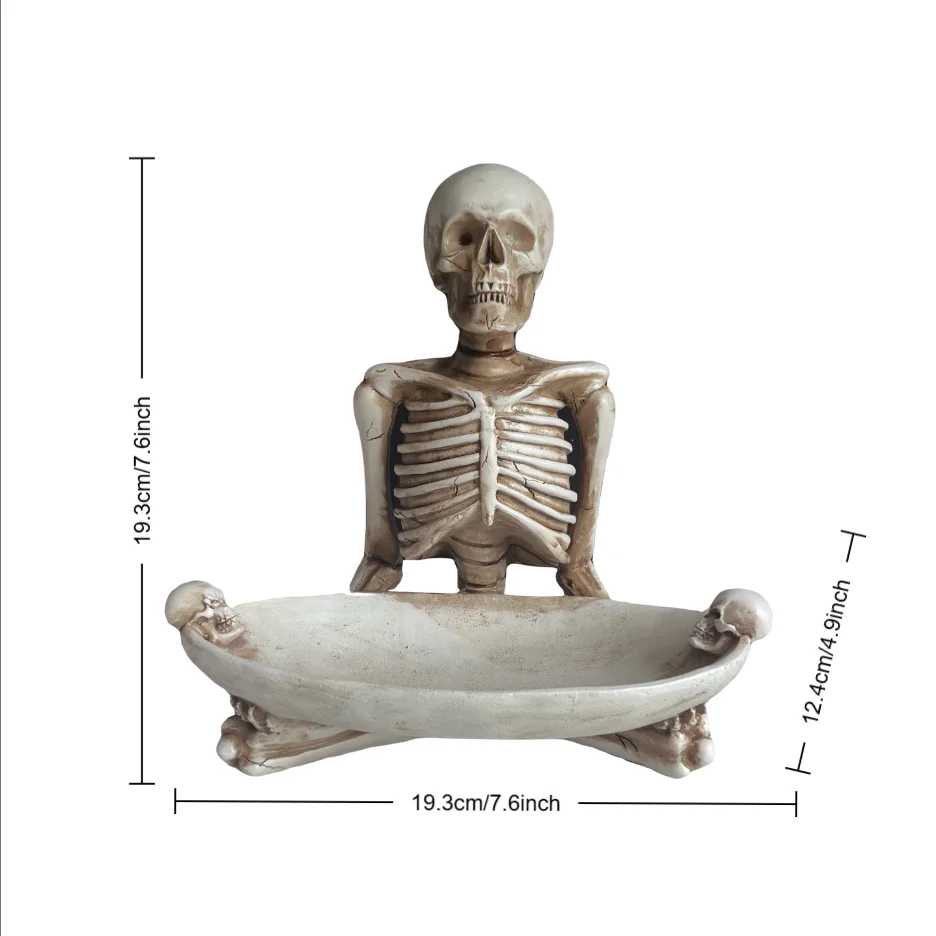 Imagine adding a touch of spooky elegance to your space with this exquisitely crafted skeleton resin ornament. Its aged, antique look with subtle shading and textured details creates a realistically eerie appearance that's perfect for Halloween or themed decor. The skeleton stands upright, holding a hollow, elongated tray decorated with small skull motifs, adding a macabre yet artistic touch. Its muted, off-white or bone color, accented with darker shading around the eye sockets, ribs, and contours, amplifies depth and realism. Designed in a European-inspired style, this ornament blends gothic charm with vintage sophistication. Whether placed indoors or outdoors, it effortlessly enhances creative, spooky ambiance for parties, holidays, or home decor, making your space uniquely captivating and atmospheric.