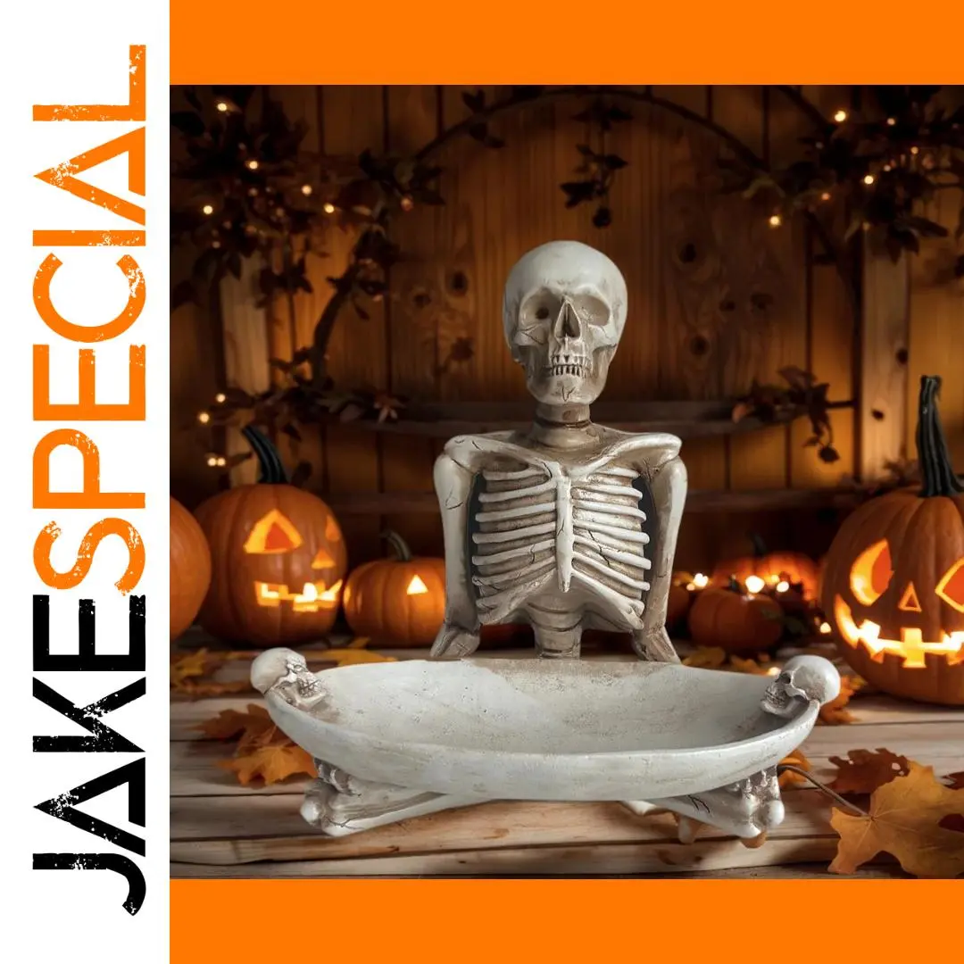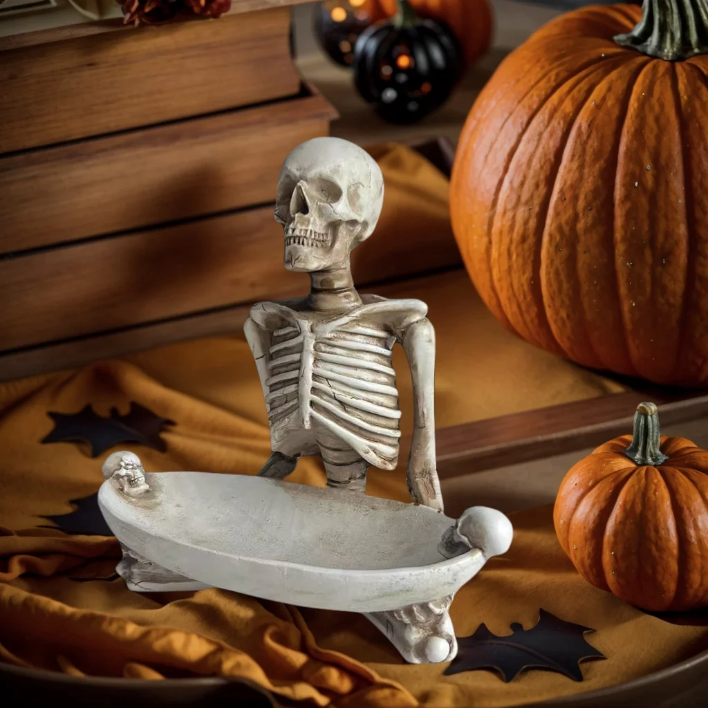 - Features an upright pose holding a hollow tray with small skull motifs, adding a spooky decorative element.
