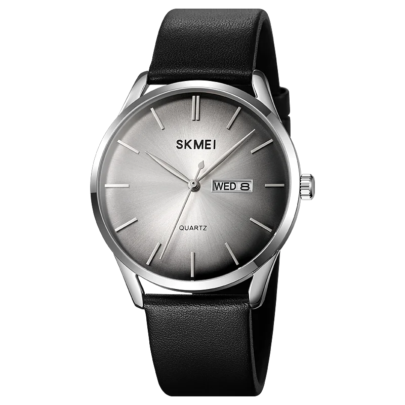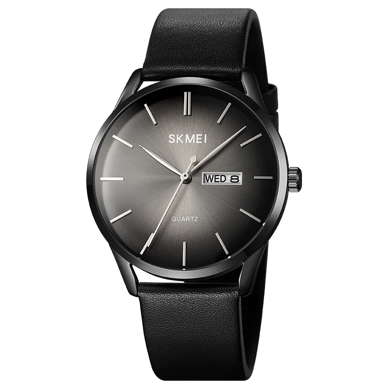 This exquisite SKMEI men's wristwatch is the perfect blend of elegance and functionality. Featuring a sleek round alloy case in sophisticated black, it boasts a slim 11.1 mm profile that feels both comfortable and stylish on your wrist. The stunning gradient gray dial transitions beautifully from light to dark, enhanced by minimalist hour and minute hands in silver-tone. Functional details include a small date window at 3 o'clock, showcasing the day of the month. Equipped with a durable black leather band measuring 25.5 cm, this watch effortlessly complements your casual or sporty looks while being water-resistant to 3 Bar. Elevate your collection with this versatile piece!