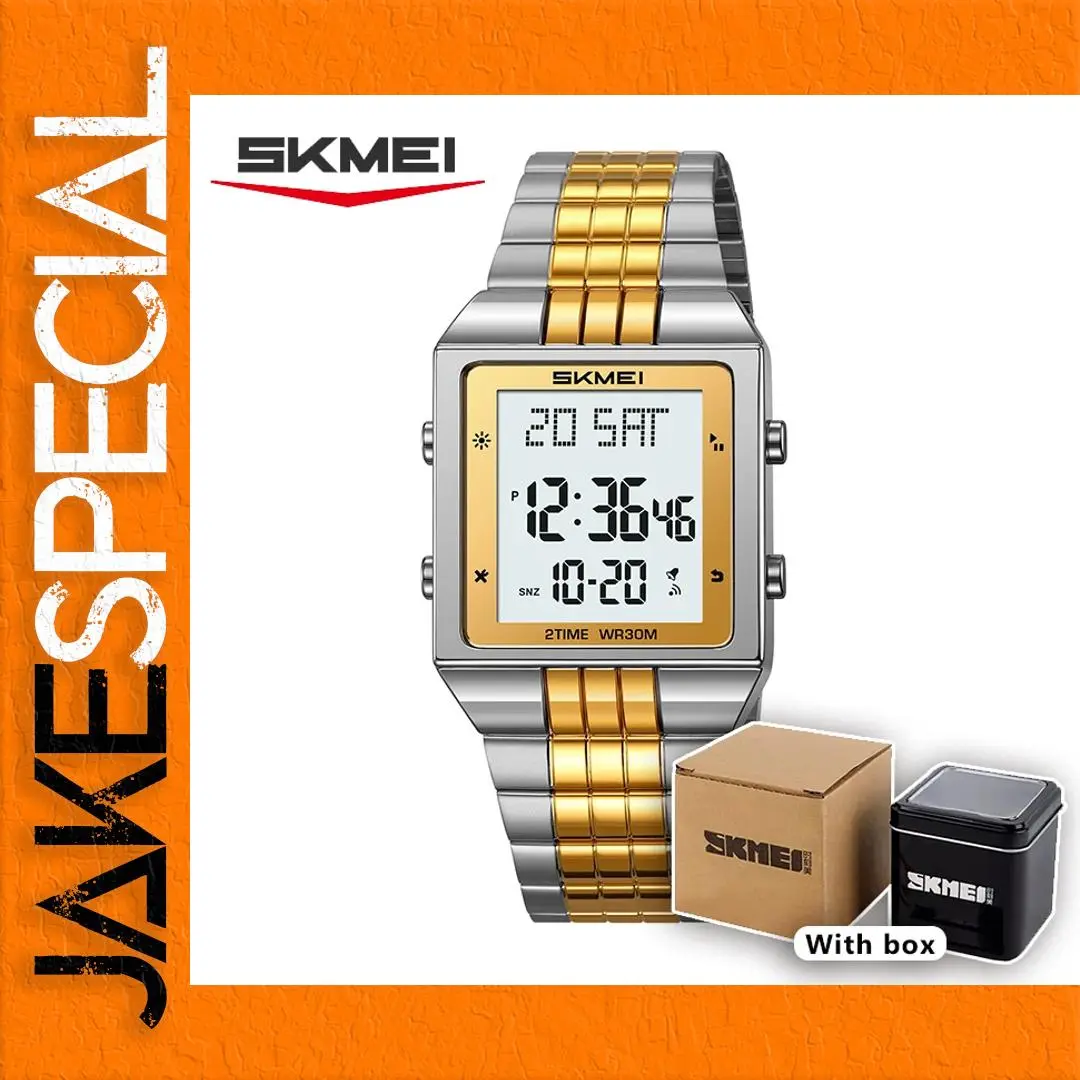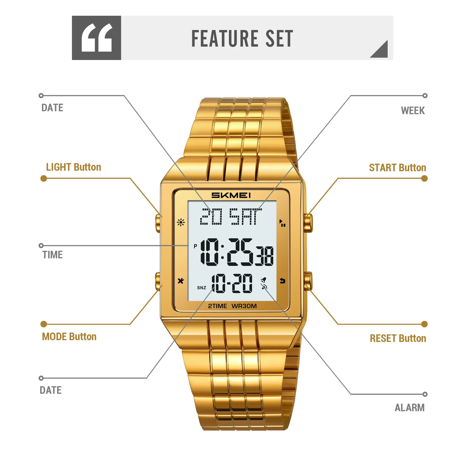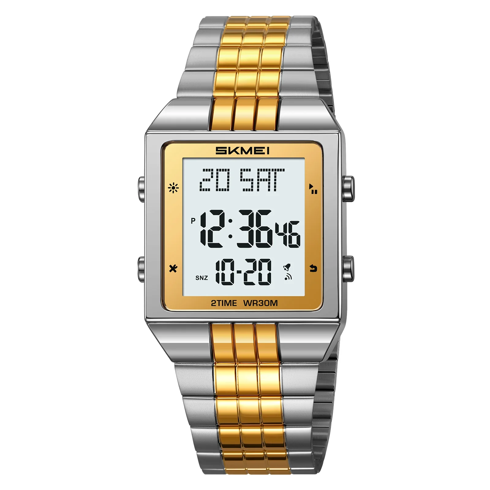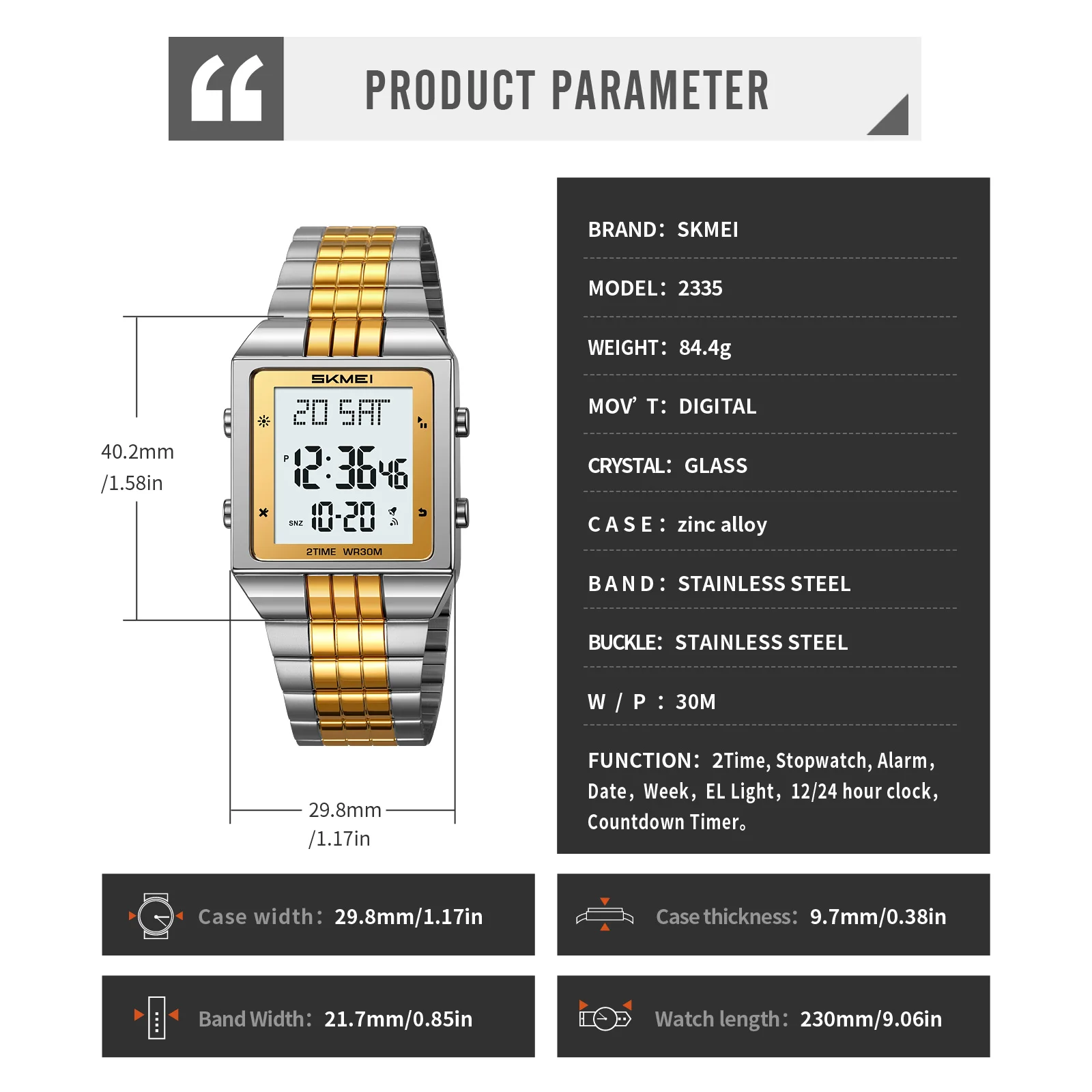 Step into the spotlight with the SKMEI Luxury Business Men's Digital Watch, model number 2335. This exquisite timepiece showcases a unique triangular case made from durable zinc alloy, resulting in a sleek and modern aesthetic. The watch gleams with a sophisticated silvery hue complemented by elegant gold accents. Its easy-to-read digital display prominently features the time, date, and day of the week. With luminous functionality, visibility in low-light conditions is guaranteed, allowing you to stay stylish anytime, anywhere. The luxurious two-tone stainless steel strap seamlessly marries silver and gold, ensuring comfort on your wrist for daily wear.