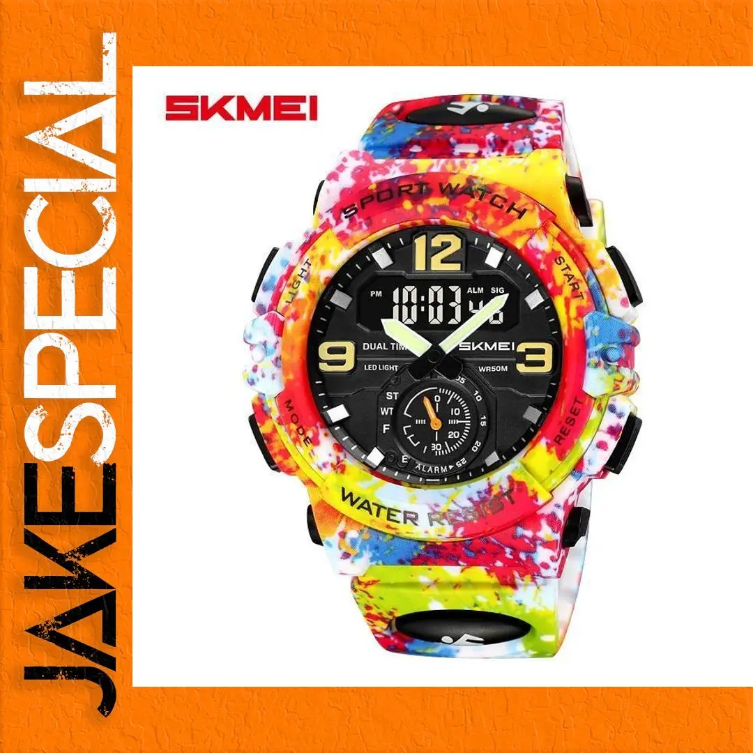 Step into your next adventure with the SKMEI 2341 Digital Electronic Large Dial Watch. This striking timepiece features a colorful camouflage pattern, merging yellows, reds, and blues into a dynamic splash design. With a robust square plastic case, a thick profile, and a large 52 mm analog-digital display, it ensures you stand out whether hiking, running, or enjoying casual outings. Its silicone band, measuring 26 cm in length and 27.7 mm in width, is both flexible and comfortable, while water resistance up to 5 bar (50 meters) makes it ideal for any environment. Elevate your wrist game with this bold and functional accessory!