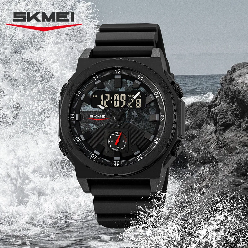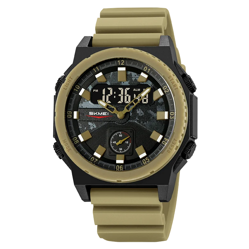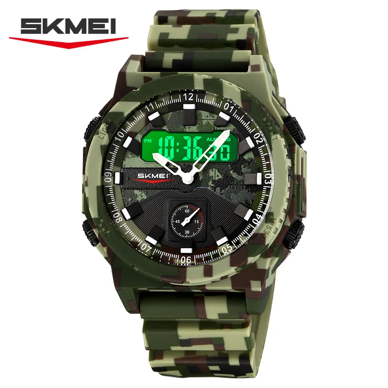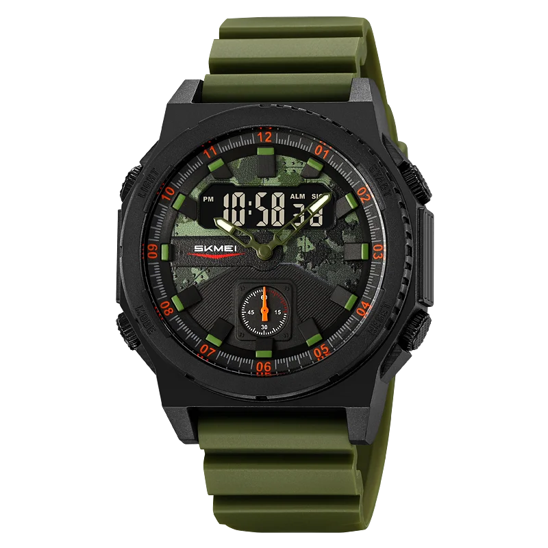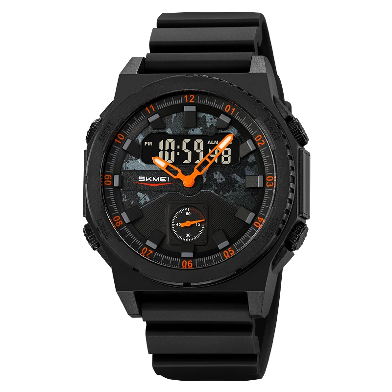 The SKMEI 2355 Sporty Men’s Electronic Watch showcases a bold black plastic case with a thickness of 15.8 mm and a striking camouflage-patterned dial featuring luminous orange hands for enhanced visibility. This versatile timepiece includes an analog-digital display and is constructed with a durable resin window, waterproof up to 5 bar for reliable performance during outdoor activities. The adjustable PU band measures 26.5 cm in length and 23 mm in width, ensuring comfort for active users. Available in colors including khaki, black orange, army green, and black black, this watch combines functionality with sporty elegance, perfect for adventurous souls.