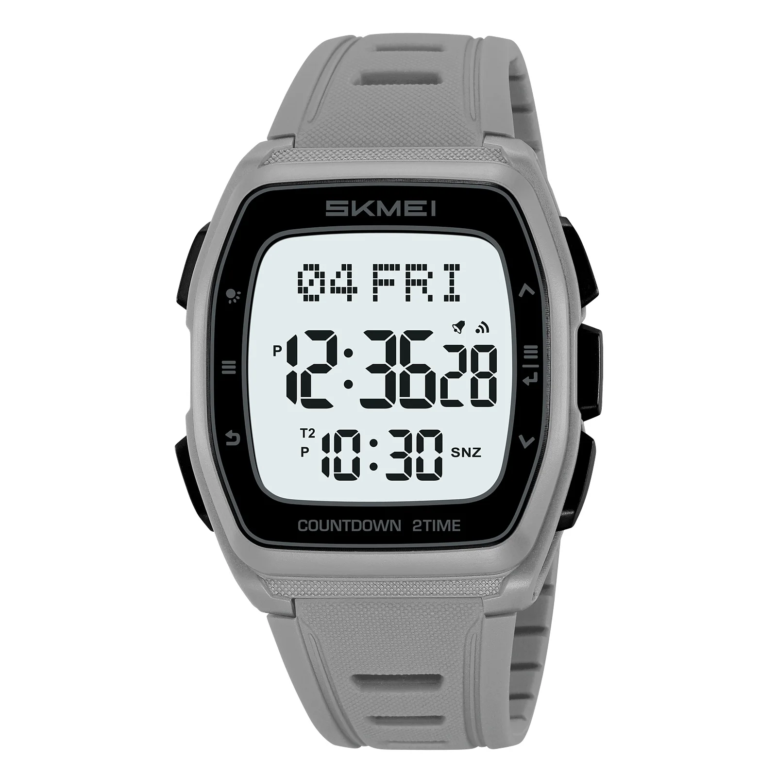 The SKMEI Model 2441 digital sport watch combines durability and modern design, featuring a sturdy light gray ABS case with a thickness of 11.5mm. The large digital display measures 38mm in width and 50mm in height, showcasing bright turquoise blue numbers for easy readability. With a comfortable 260mm long silicone/TPU strap that is 26mm wide, this watch is designed for active lifestyles. It boasts a water resistance of up to 5 Bar (50 meters), includes a CR2032 battery, and offers functionalities like a chronograph, complete calendar, alarm, week display, and shock resistance. The stainless steel buckle ensures a secure fit.